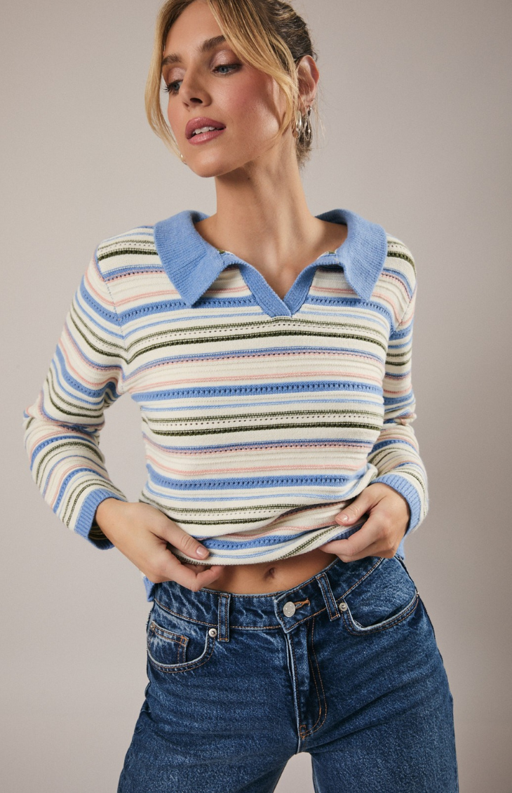 Classic with a playful twist, the Cove Collared Sweater is an easy standout for everyday wear. Designed with a soft collared neckline and long sleeves, this knit features subtle multicolor stripe detailing that adds just the right amount of interest. Finished with ribbed trim for a polished look, it’s perfect for pairing with denim or trousers for a cozy yet put-together outfit.