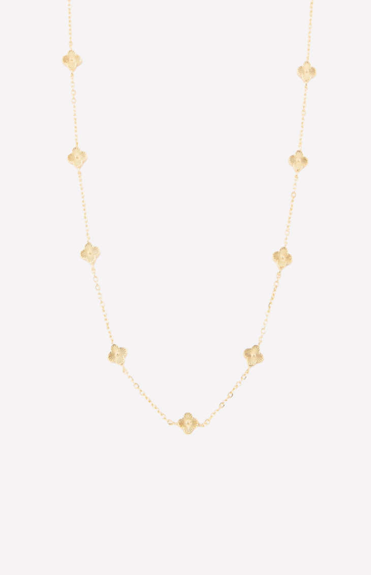 Delicate and effortlessly refined, the Anya Luxe Necklace brings a soft, feminine touch to your everyday style. This 18K gold plated piece features a dainty chain adorned with intricately textured clover accents, creating a subtle shimmer with every movement.