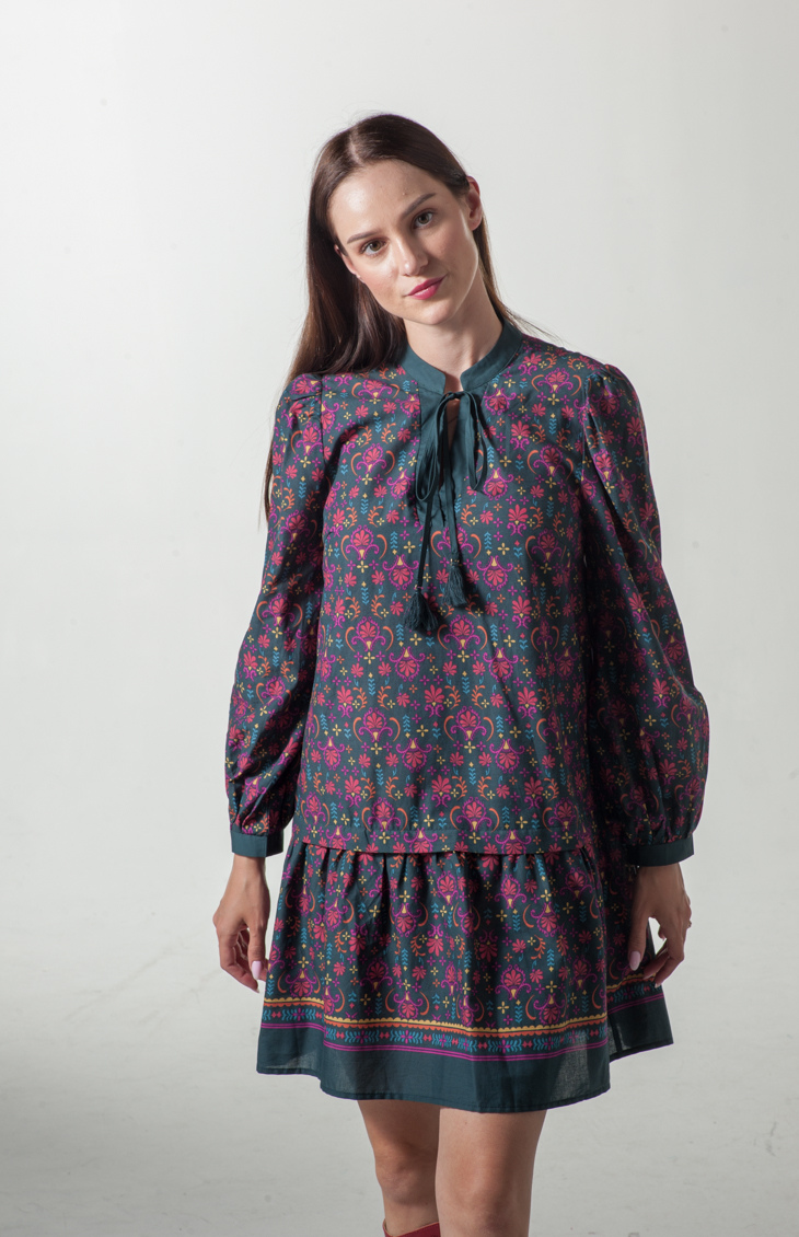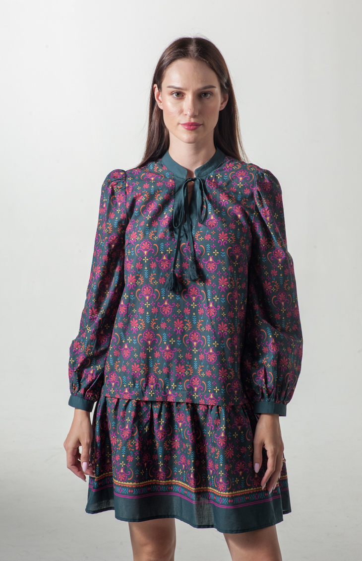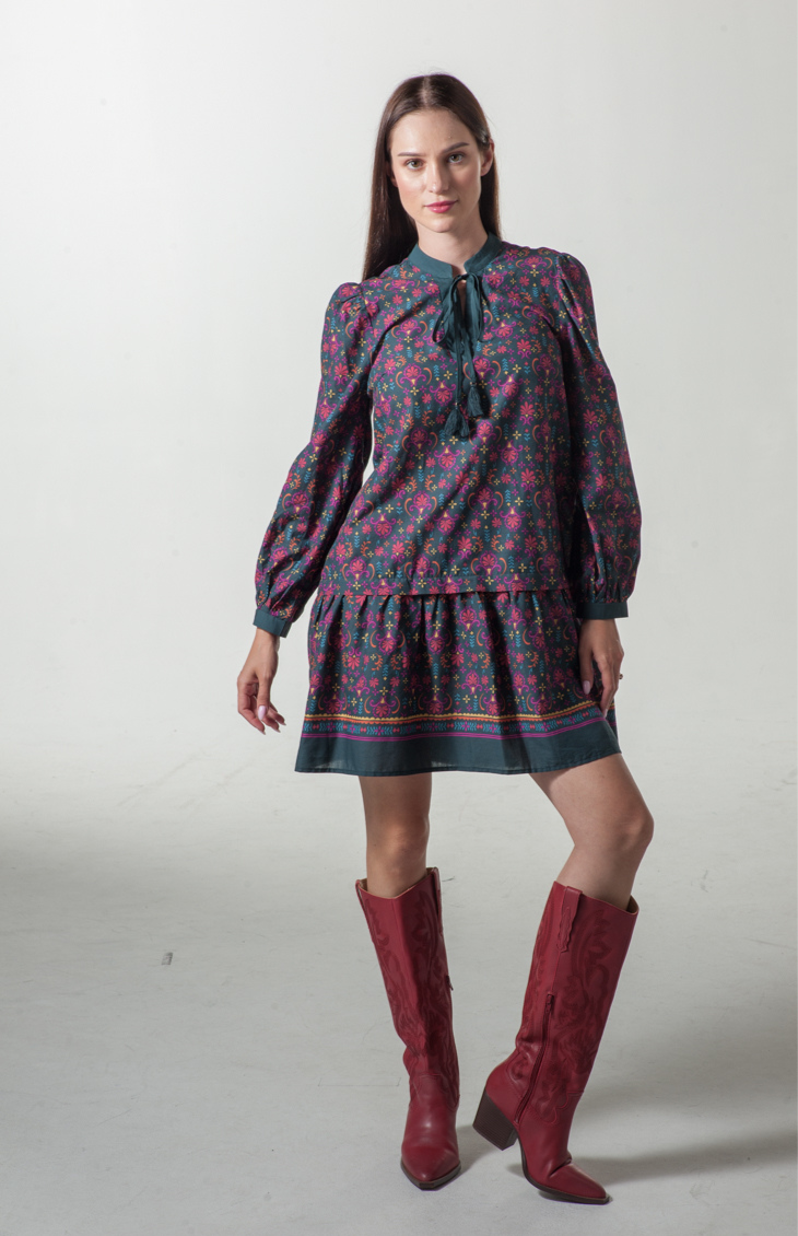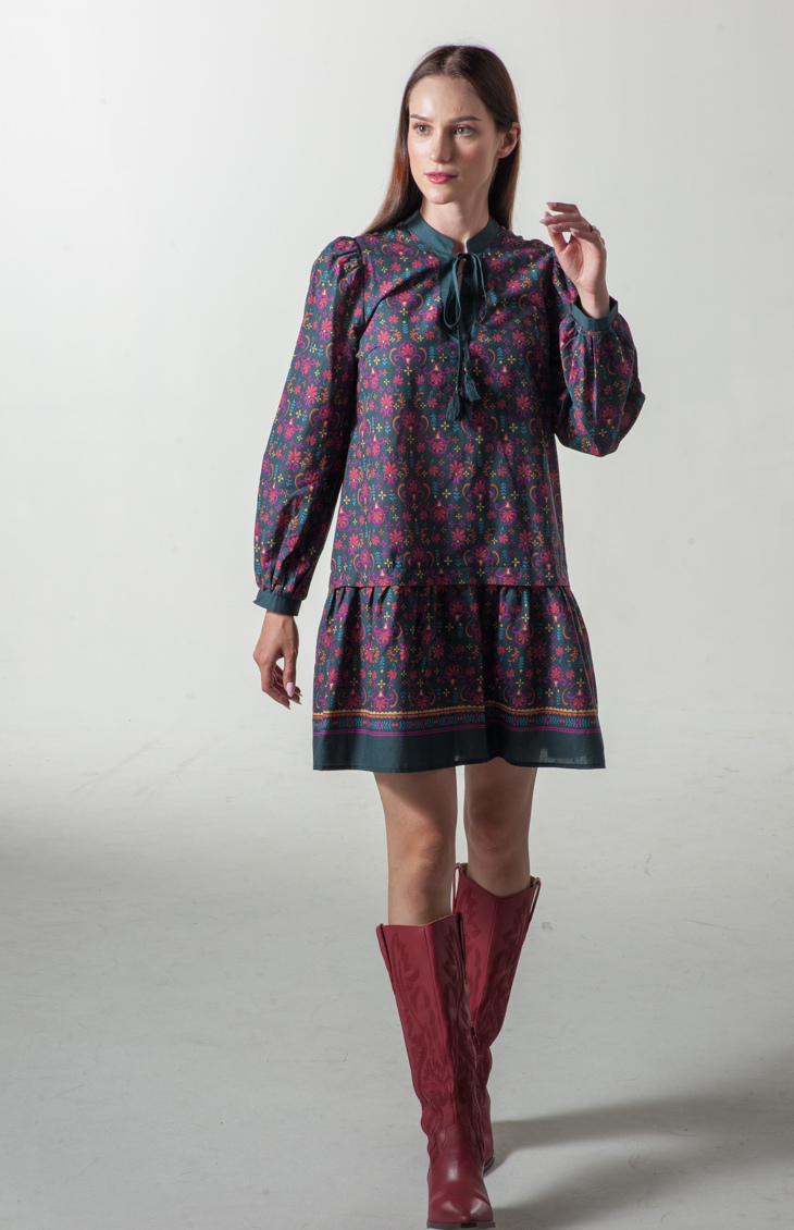 The Brian Mini Dress features a dark teal base with a vibrant floral and paisley print in pink, purple, and green. It has a high neckline with a tie detail and tassels for a vintage touch. Long puff sleeves create a feminine silhouette, while the relaxed A-line shape flares out for comfort. The tiered hemline adds playful structure, and the lightweight fabric is perfect for transitioning between seasons.