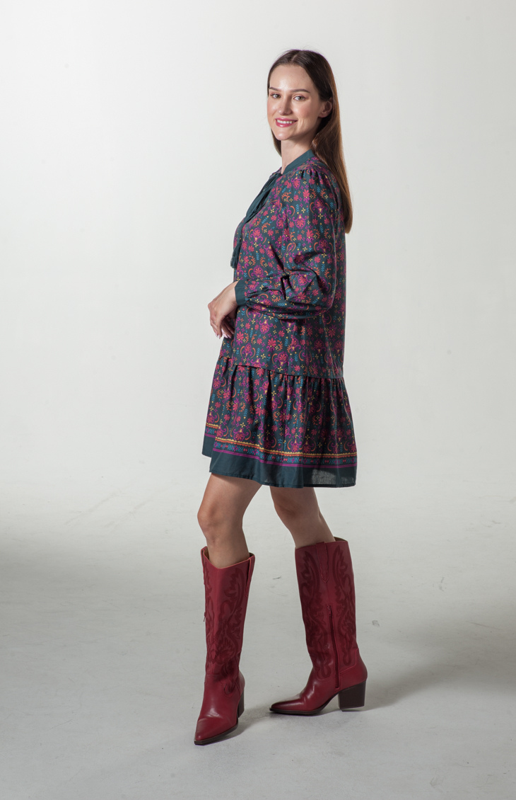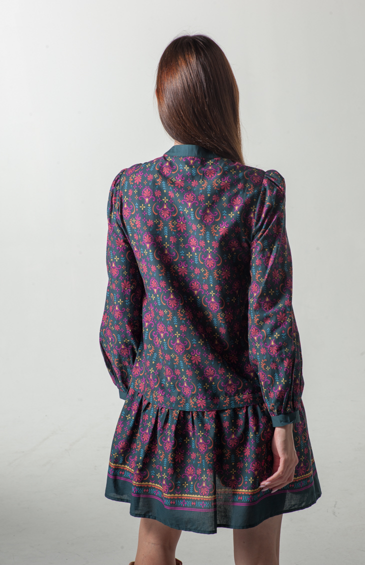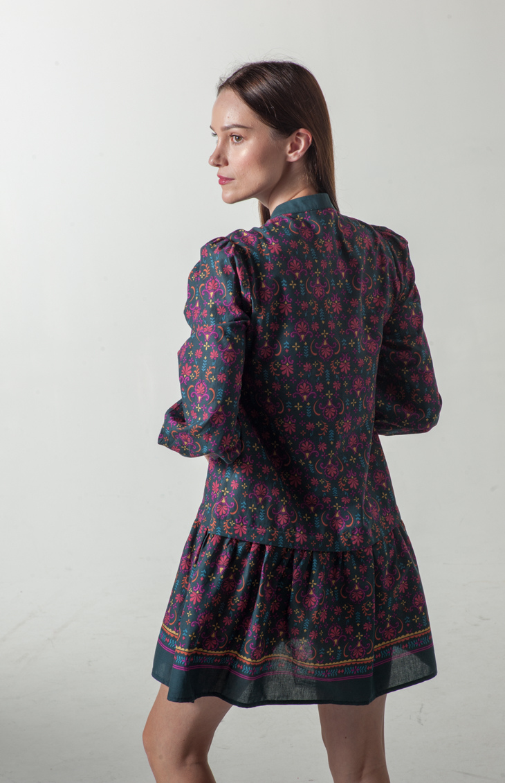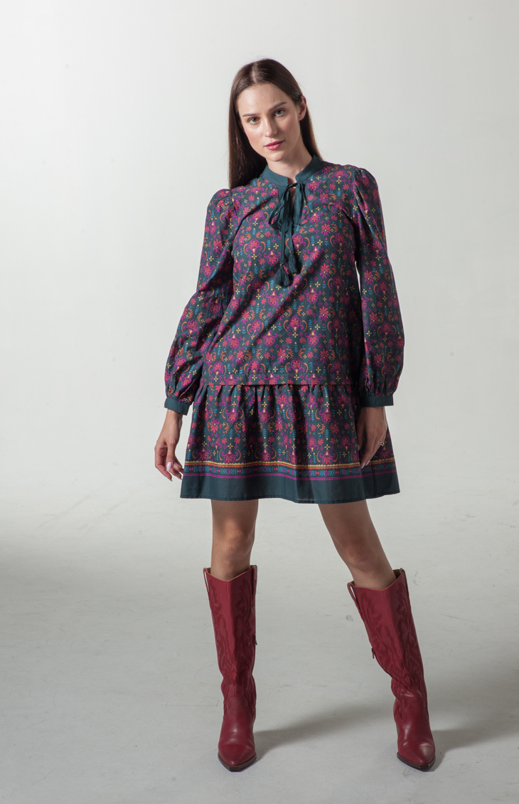 The Brian Mini Dress features a dark teal base with a vibrant floral and paisley print in pink, purple, and green. It has a high neckline with a tie detail and tassels for a vintage touch. Long puff sleeves create a feminine silhouette, while the relaxed A-line shape flares out for comfort. The tiered hemline adds playful structure, and the lightweight fabric is perfect for transitioning between seasons.