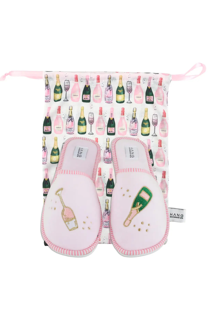 Machine washable. Lightweight, comfortable materialDurable, flexible sole. Embroidered champagne-themed design.