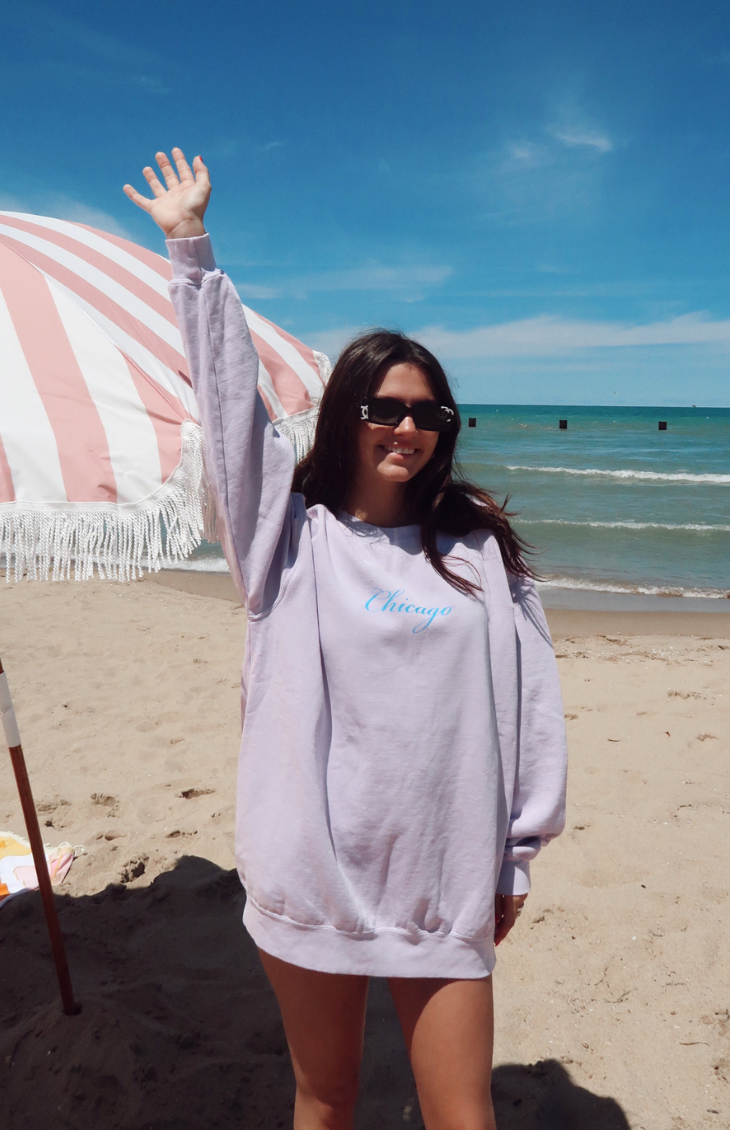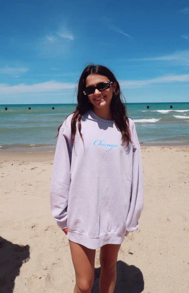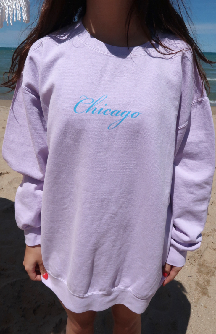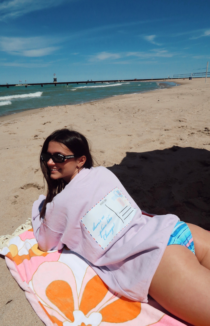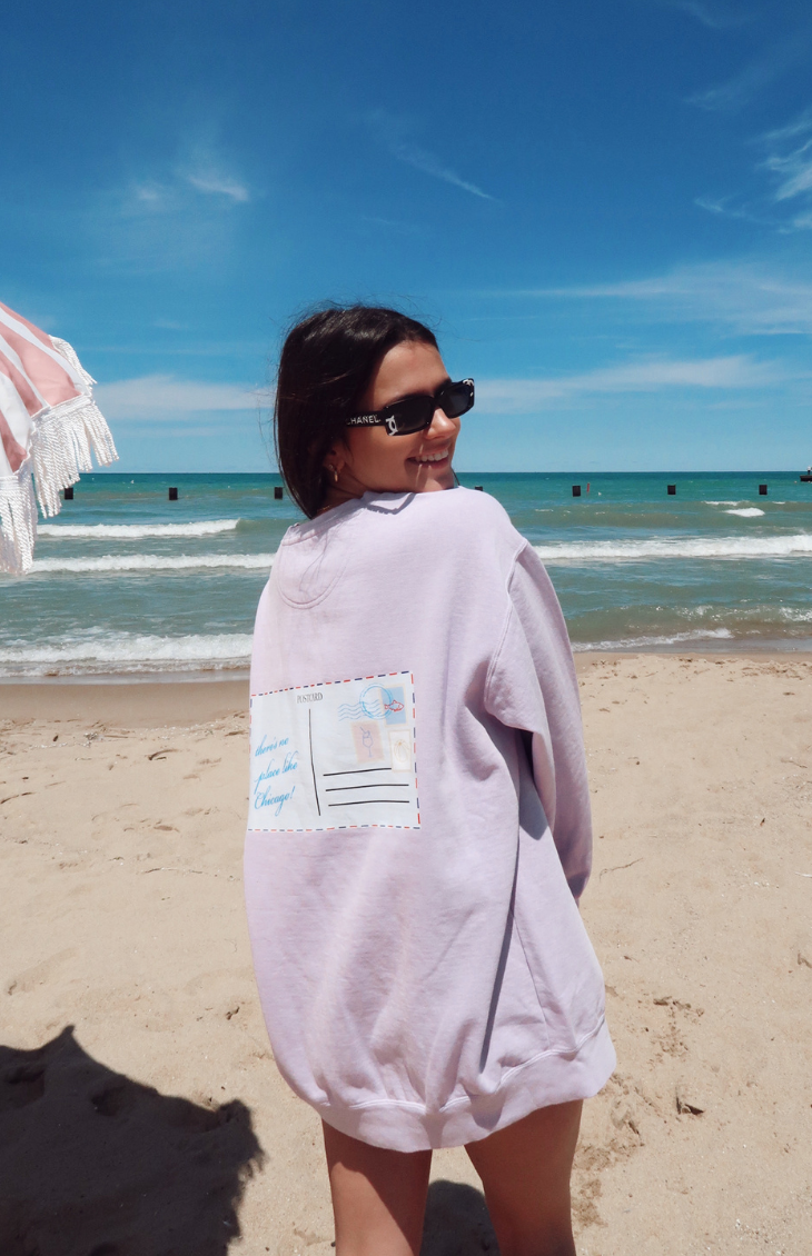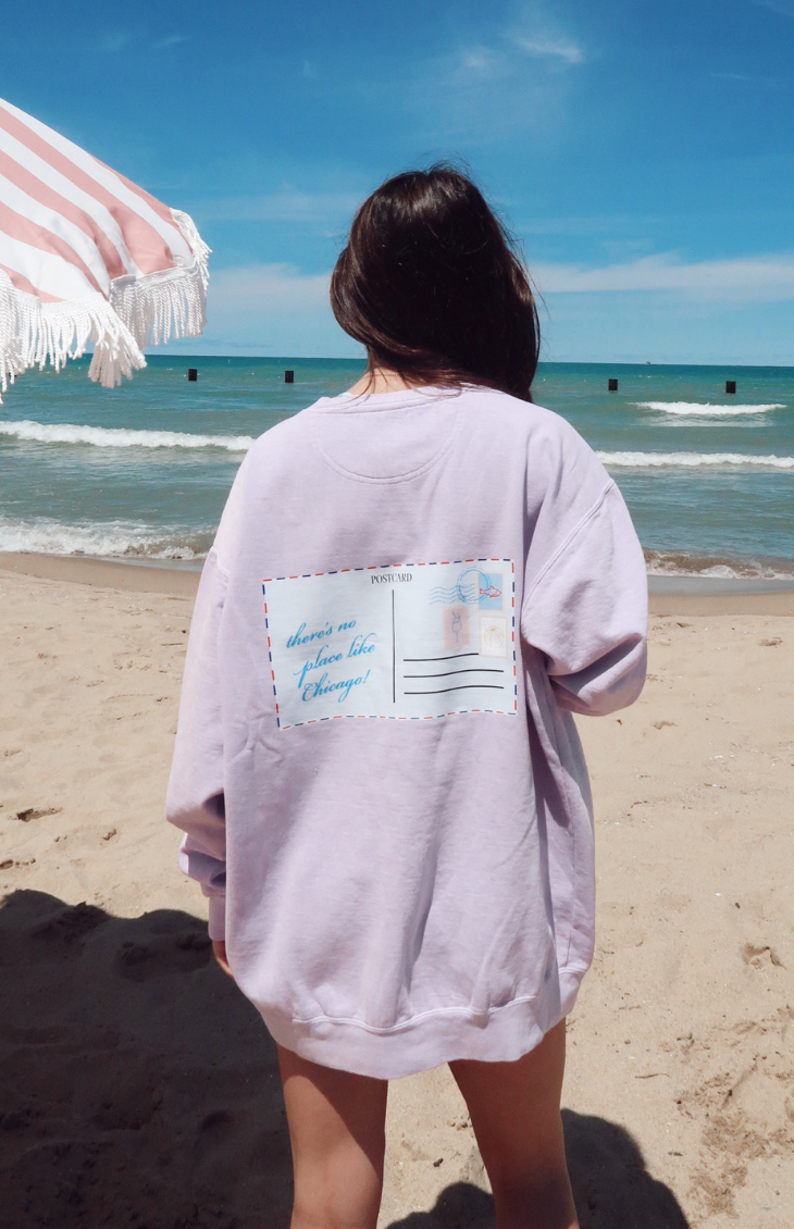 Embrace European summer vibes with the Chicago Postcard Sweatshirt. This dreamy orchid (lavender) crew neck features "Chicago" on the front and a stylish postcard graphic on the back, evoking the charm of an Italian getaway. Perfect for adding a touch of wanderlust to your wardrobe, this sweatshirt is both cozy and chic. Whether you're exploring the city or relaxing at home, the Chicago Postcard Sweatshirt brings a touch of summer elegance to any outfit.
