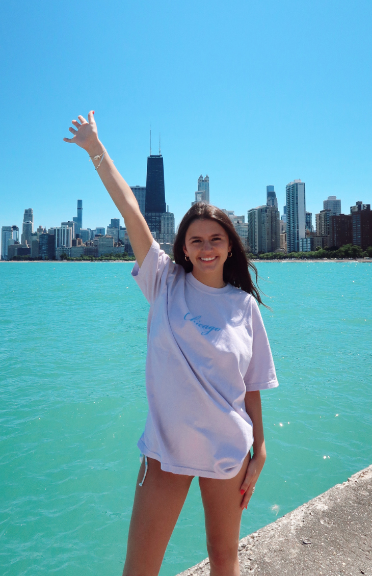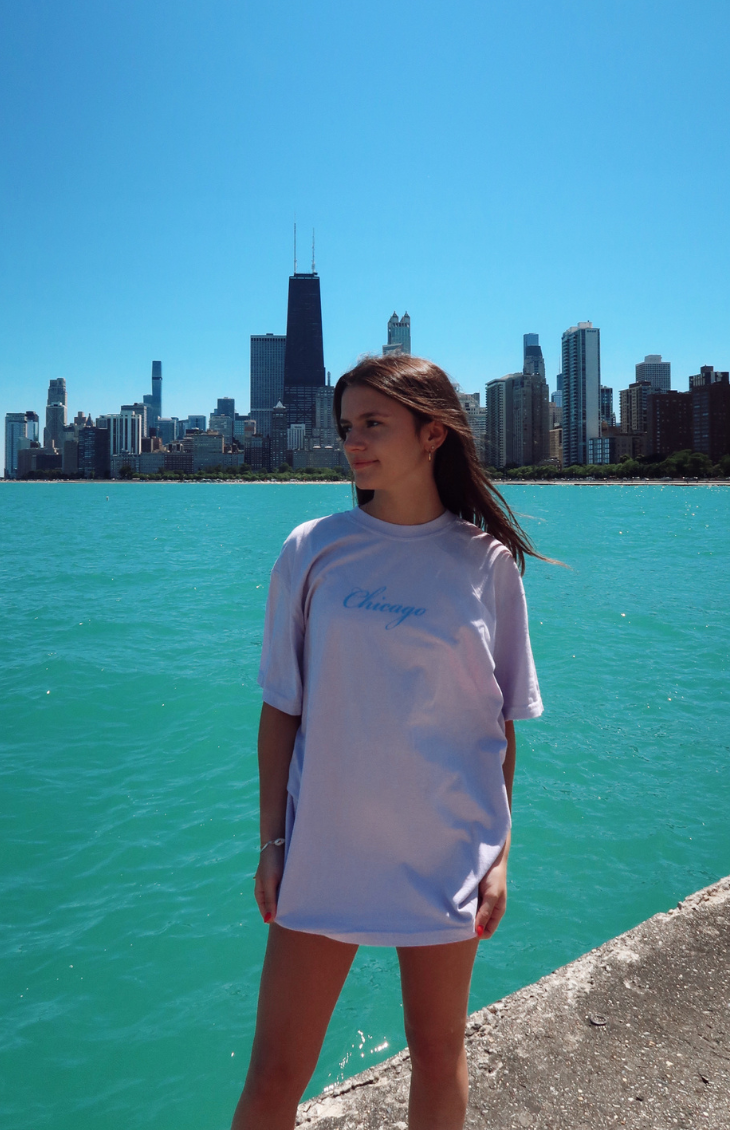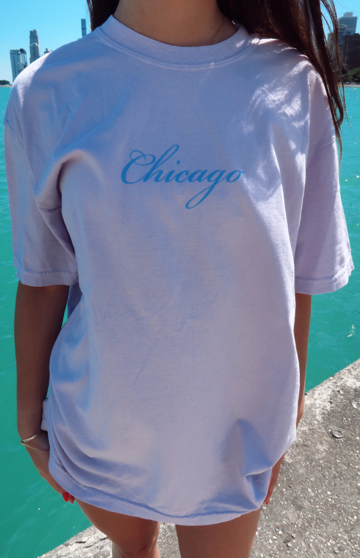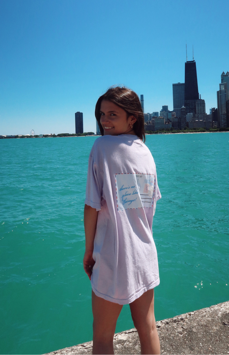 Introducing the Chicago Postcard T-Shirt, the perfect blend of style and city pride. This orchid-colored tee features "Chicago" printed on the front and a charming postcard graphic on the back. Ideal for adding a touch of summer flair to your wardrobe, the Chicago Postcard T-Shirt is both cute and comfortable. Show off your love for the Windy City in a fun and fashionable way with this standout piece.