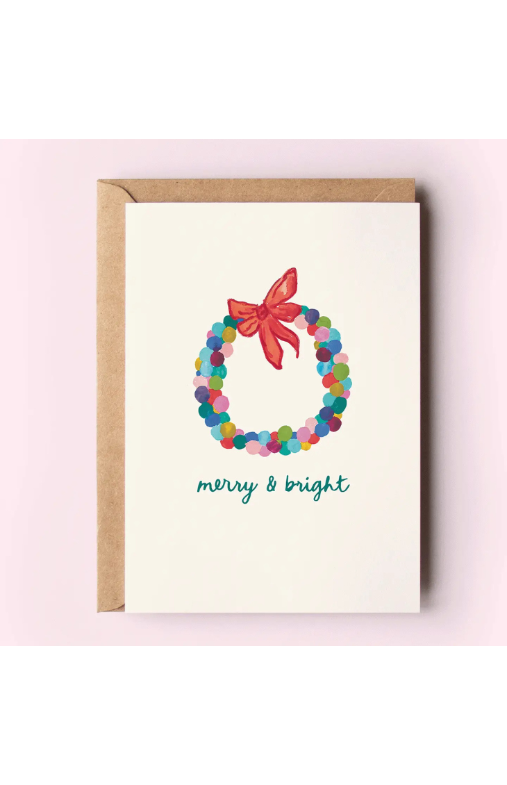 Send a winter-wonderful message with this adorable 5x7 card, featuring a colorful bauble wreath with a bow along with the simple phrase, "merry & bright". The card is blank inside for your own personal message, and comes with a brown kraft envelope. Perfect to celebrate the Winter season, Christmas wishes, thinking of you, just because, and more!