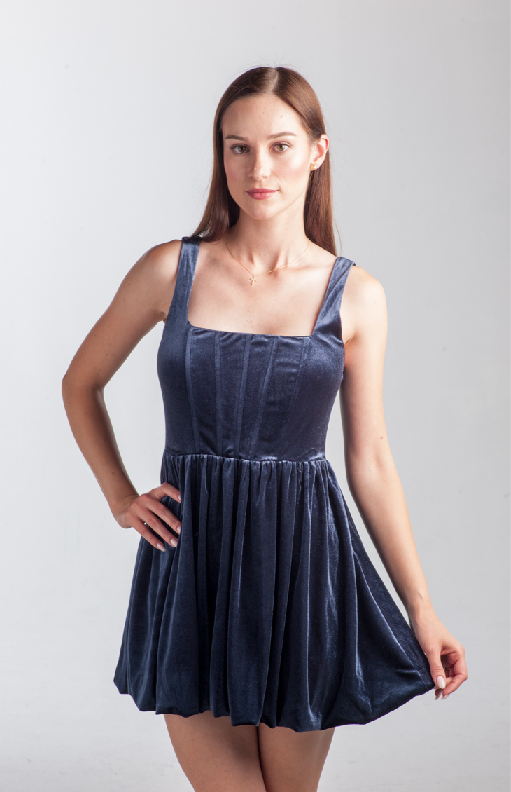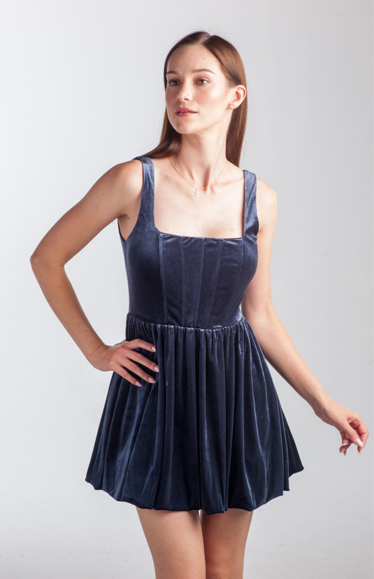 The Flannel & Frost Velvet Mini Dress is a stunning navy mini dress crafted from soft velvet. It features a flattering A-line silhouette with a chic square neckline that elegantly flares out for a playful look. This dress is perfect for holiday parties or special occasions, adding a touch of luxury to your wardrobe.