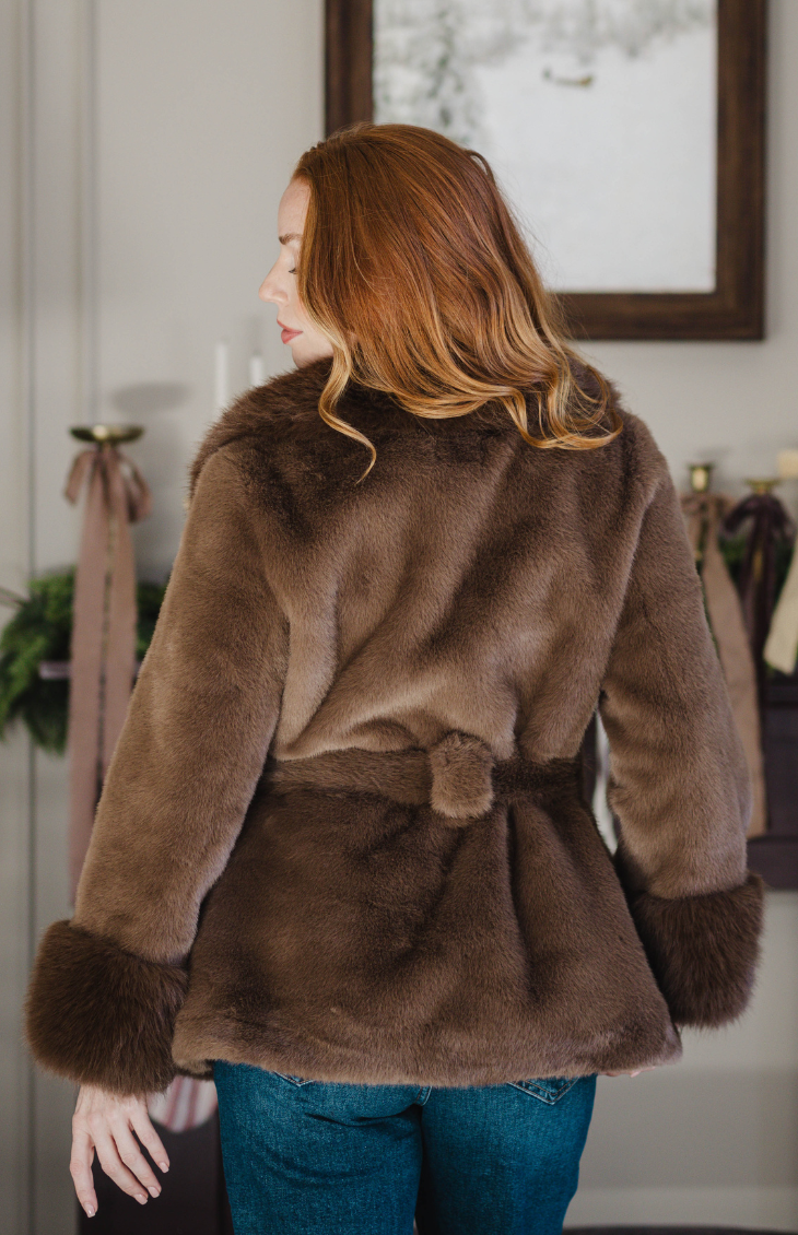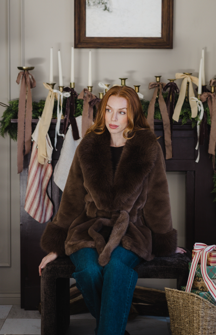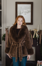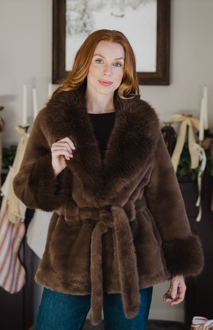 Wrap yourself in luxury with the Georgia Fur Coat. Crafted from plush faux fur, this rich chocolate-brown coat features a dramatic shawl collar, cozy cuffed sleeves, and a flattering belted waist that allows you to customize your silhouette. Soft, warm, and effortlessly elegant, it’s the perfect statement layer for winter outings, holiday events, or elevating any everyday look.