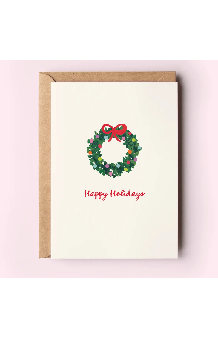 Send a winter-wonderful message with this adorable 5x7 card, featuring colorful holiday wreath along with the simple phrase, "Happy Holidays". The card is blank inside for your own personal message, and comes with a brown kraft envelope. Perfect to celebrate the Winter season, Christmas wishes, thinking of you, just because, and more!