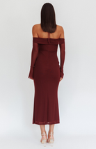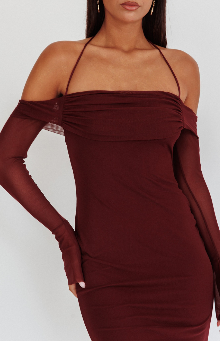Turn heads this season in the Holiday Harmony Maxi Dress. Designed in a rich, deep burgundy hue, this sleek silhouette features an off-the-shoulder neckline paired with a delicate halterneck drawstring for an elegant, feminine touch. The fitted bodice and long mesh sleeves create a beautifully sculpted look, while the lined mesh fabric drapes effortlessly into a graceful maxi-length skirt. An open back detail adds a hint of drama, making this the perfect statement dress for festive celebrations and winter soirées.