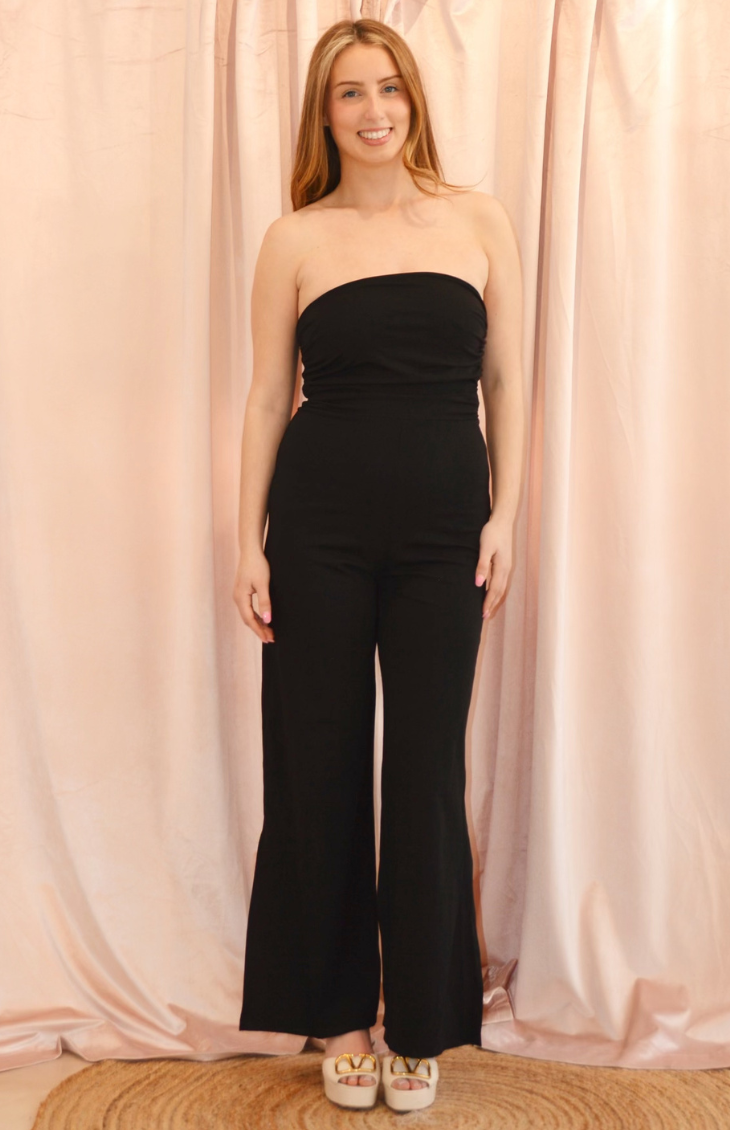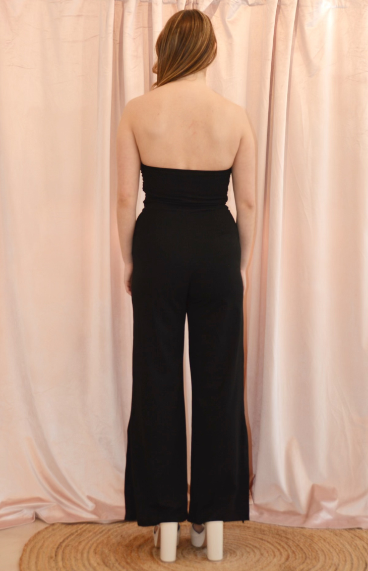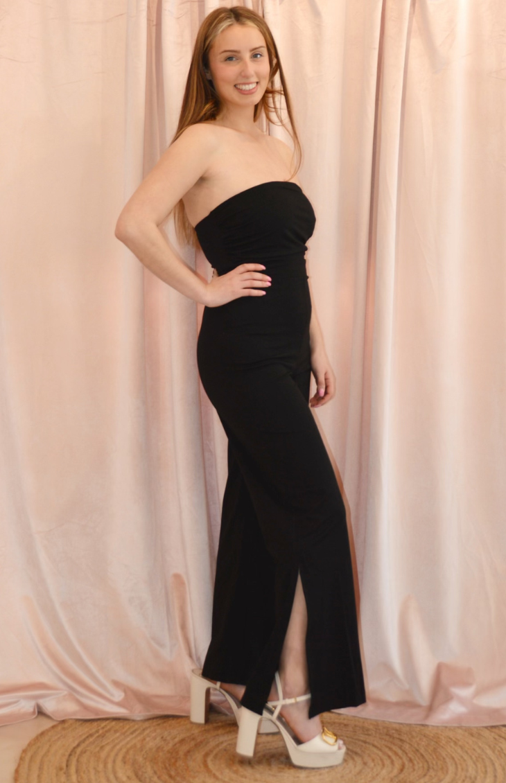 Dive into comfort and style with the Kaitlyn Jumpsuit. This strapless ensemble is the epitome of chic simplicity, featuring a super comfy fit that doesn't compromise on elegance. With a side zipper for ease of wear and ruching detail on the sides of the top for a flattering silhouette, this jumpsuit is your go-to for any occasion that requires a touch of sophistication and comfort.