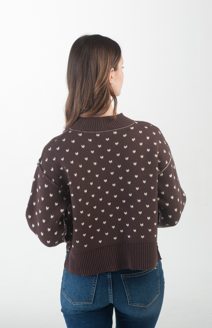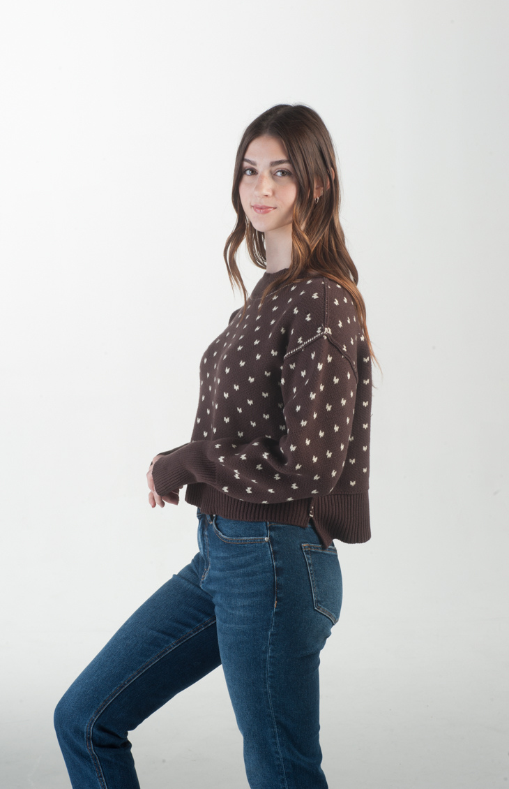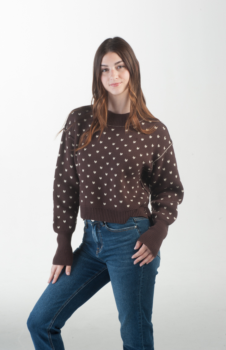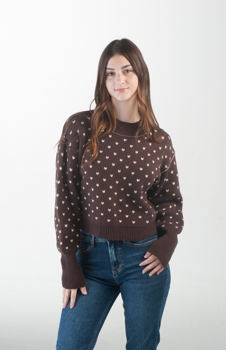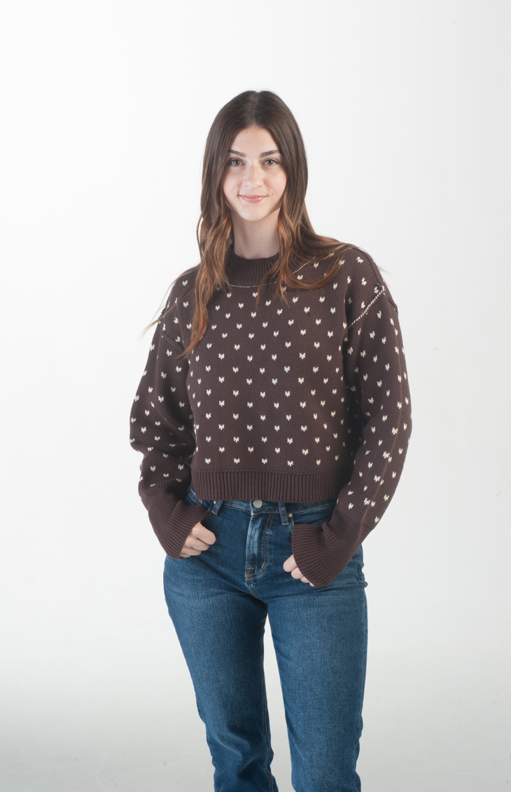 The Kimberly Sweater features a variety of colors with a charming light beige mini heart print. Designed with a relaxed, slightly oversized fit, this sweater offers long sleeves with ribbed cuffs and a classic crew neckline. Its comfortable and cozy fabric makes it perfect for layering.