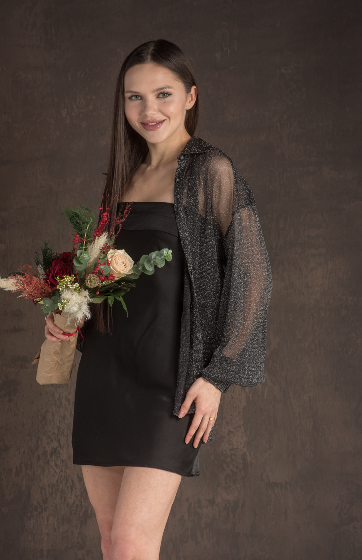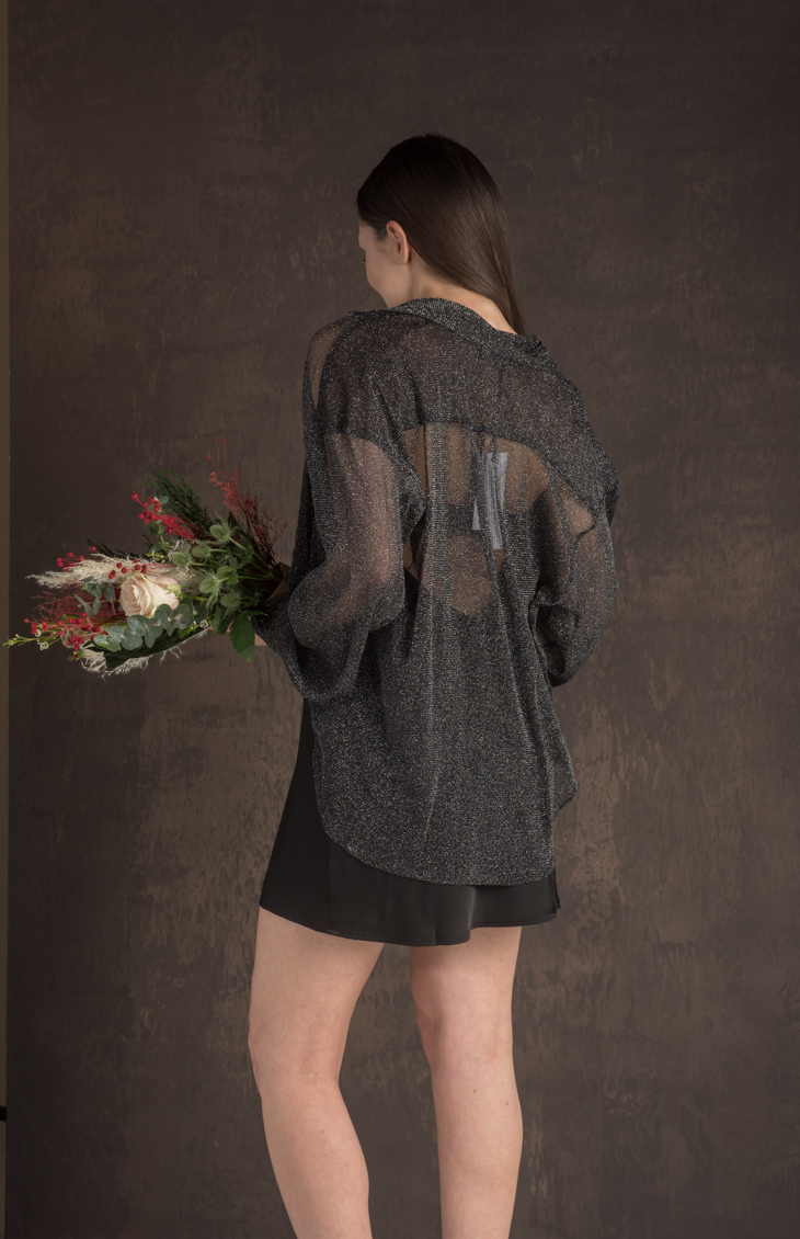 The Maven Julia Shirt is the ultimate layering piece for your wardrobe. This sheer button-down top, with its shimmering lurex accents, adds a touch of glam to any outfit. Perfect for pairing over a sleek mini dress or styling with high-waisted trousers for an elevated look.