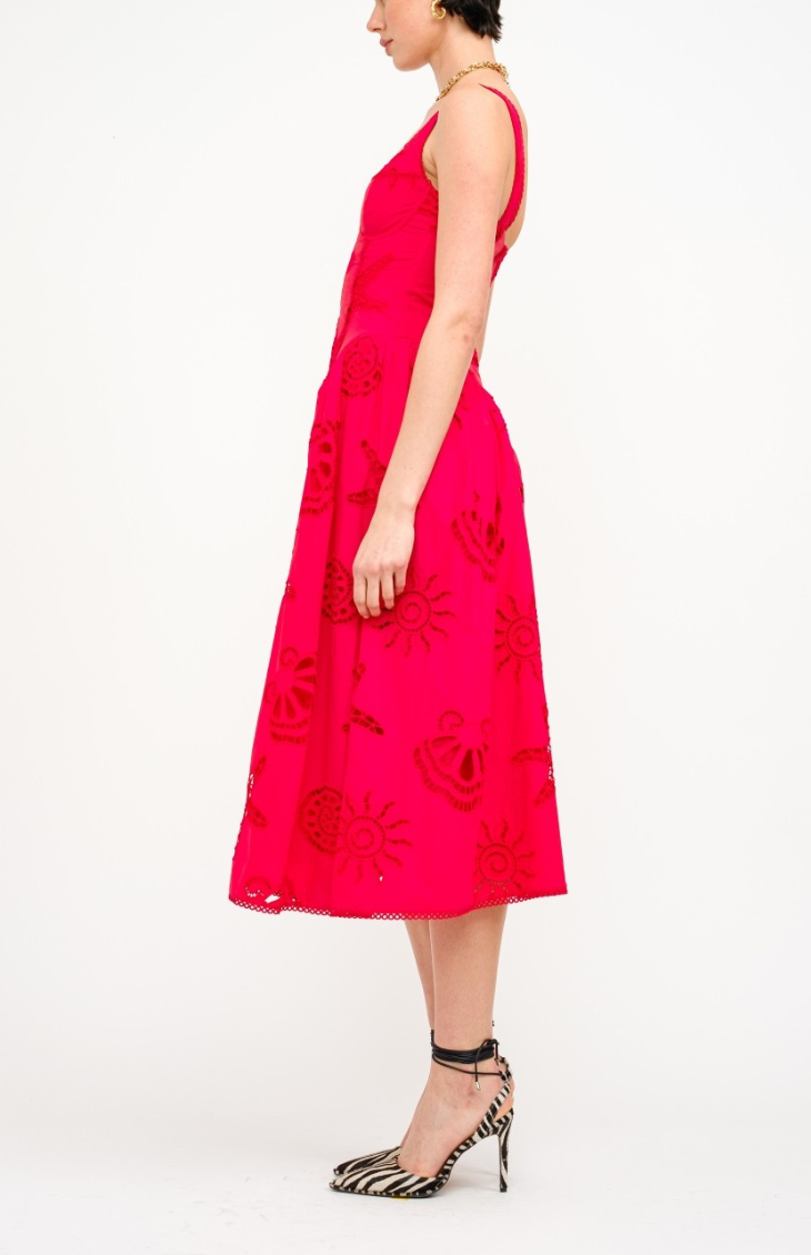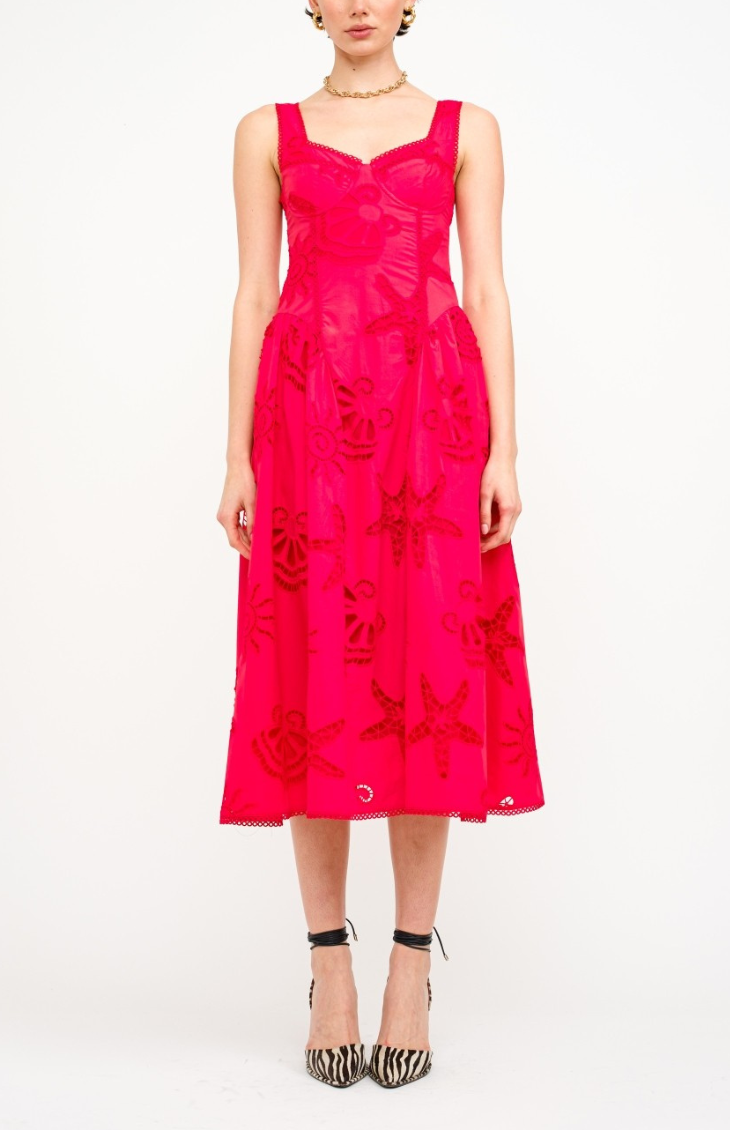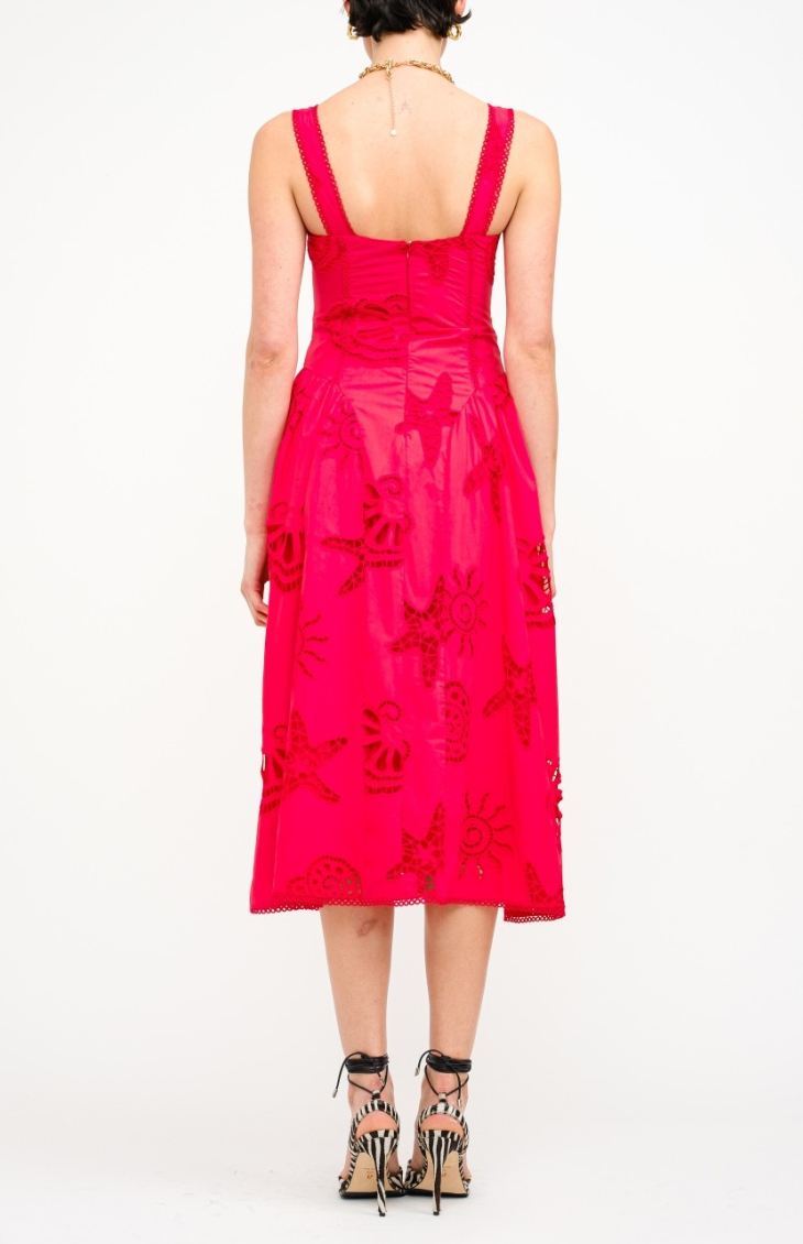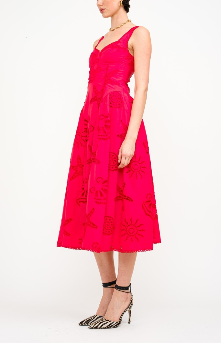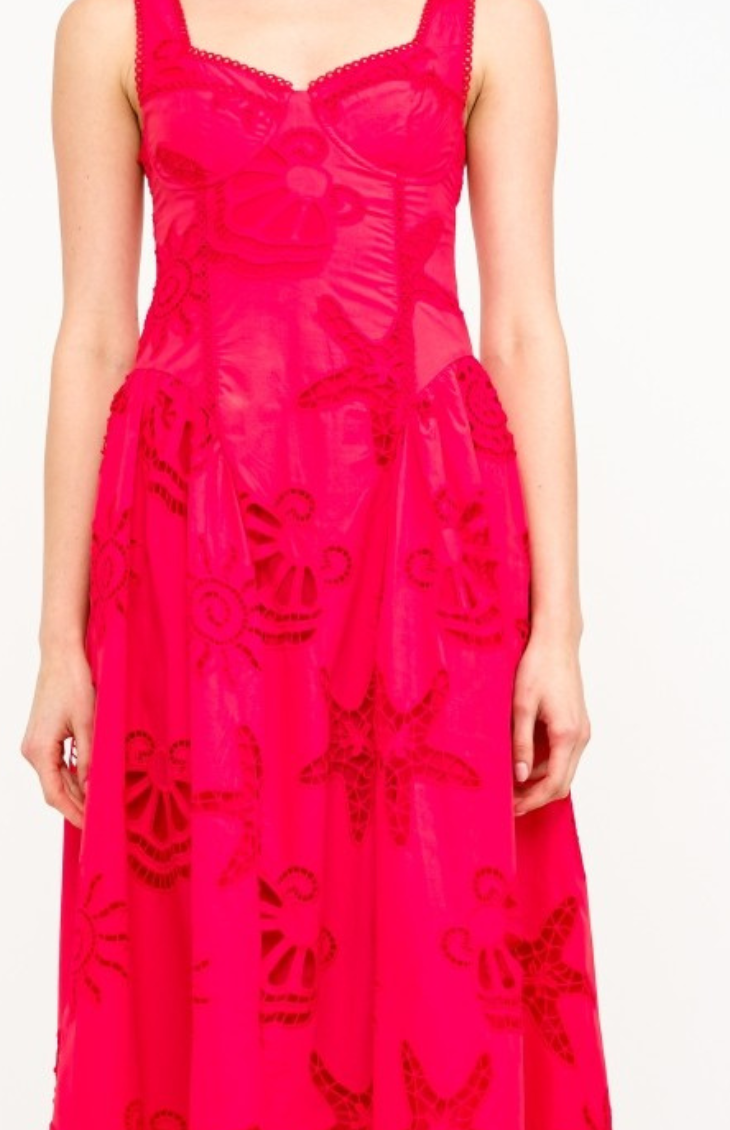 The Reagan Midi Dress is flattering and fiery for summer with its chili red color and structured bustier top with a scalloped trim. It has unique embroidered details of different beachy icons such as starfish, suns, and shells. Its drop waist and midi flowing skirt add an extra element of drama and elegance. Pair this cotton corseted dress with fun heels for your next tropical vacation or beach party.