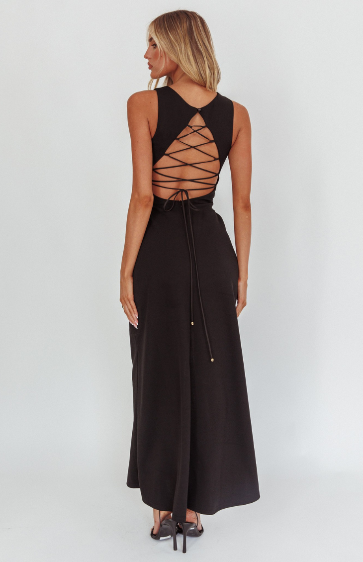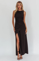 Make an entrance in the Shinning Bright Maxi Dress. Designed with a sleek high neckline, flattering side ruching, and a dramatic thigh-high slit, this floor-length gown blends elegance with bold, modern flair. The open lace-up back adds a striking, sophisticated touch—perfect for evenings that call for standout style.