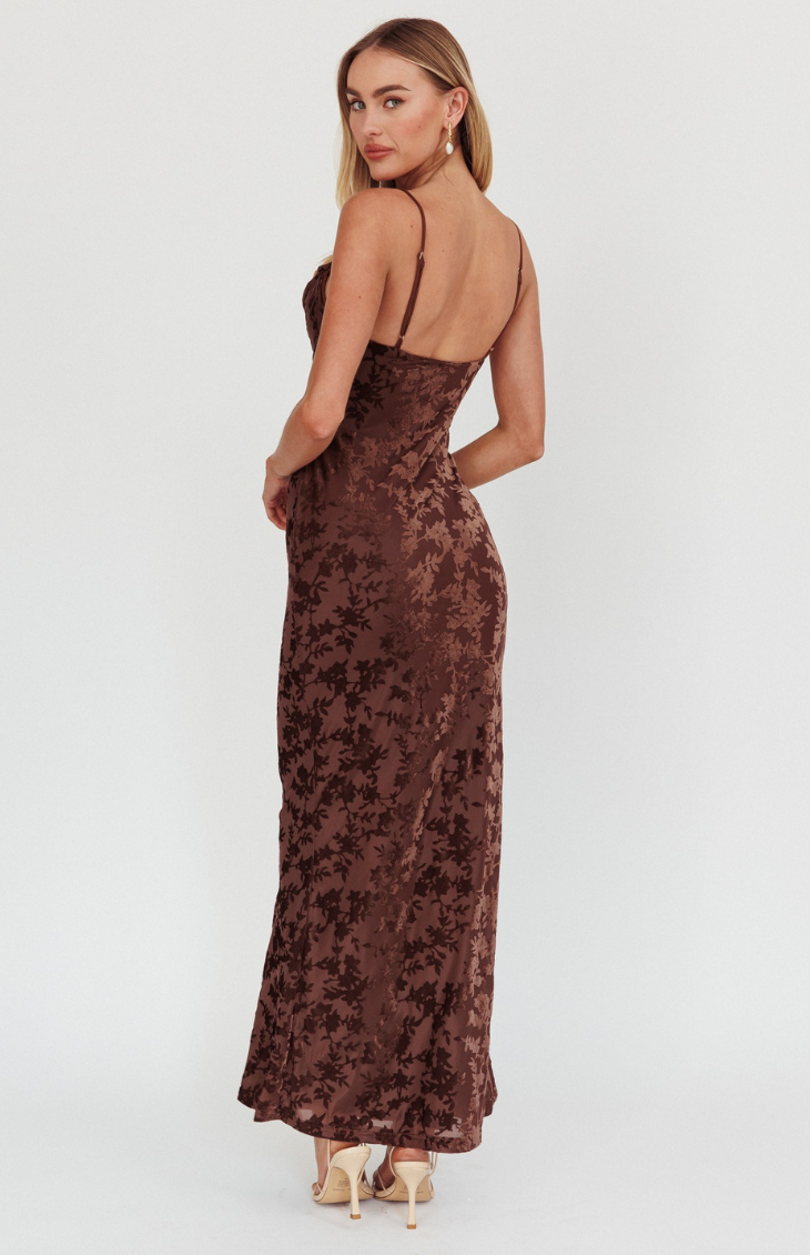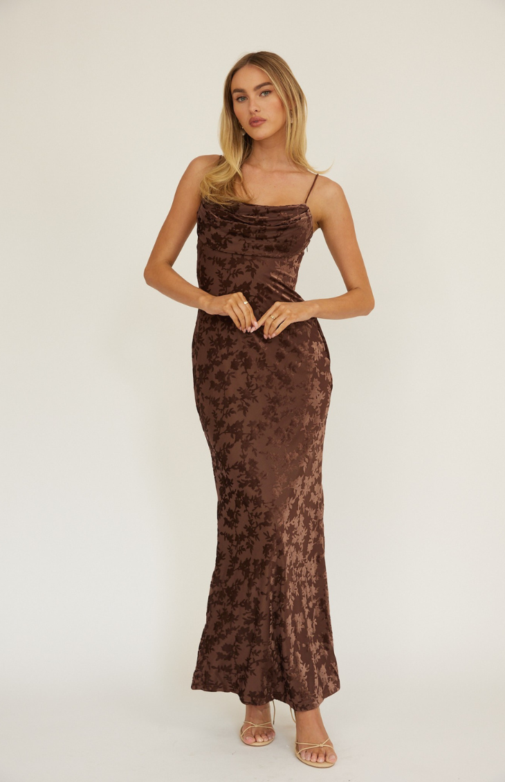 Elevate your evening look with the Snowflake Sparkle Maxi Dress. This floor-length stunner features a fitted silhouette adorned with a soft, tonal floral pattern that adds depth and dimension. Its delicate spaghetti straps and subtle cowl neckline create an effortlessly elegant shape, making it the perfect choice for any special occasion.