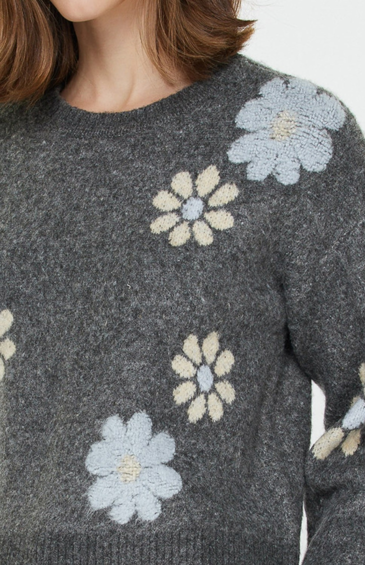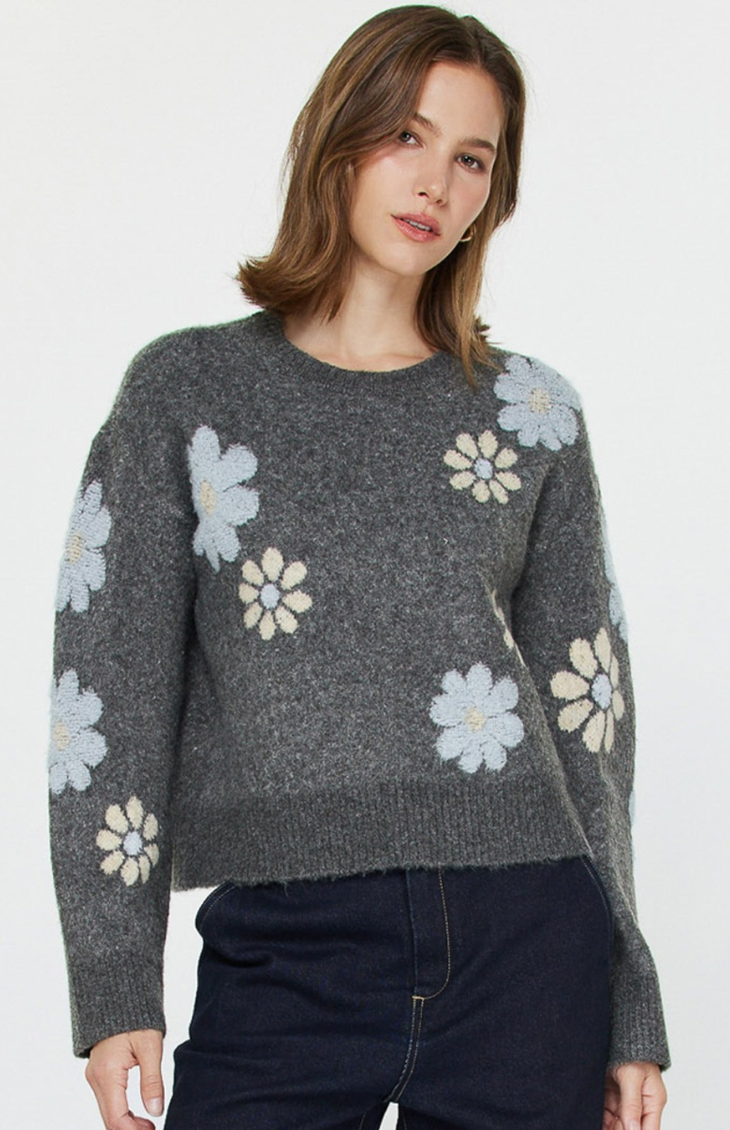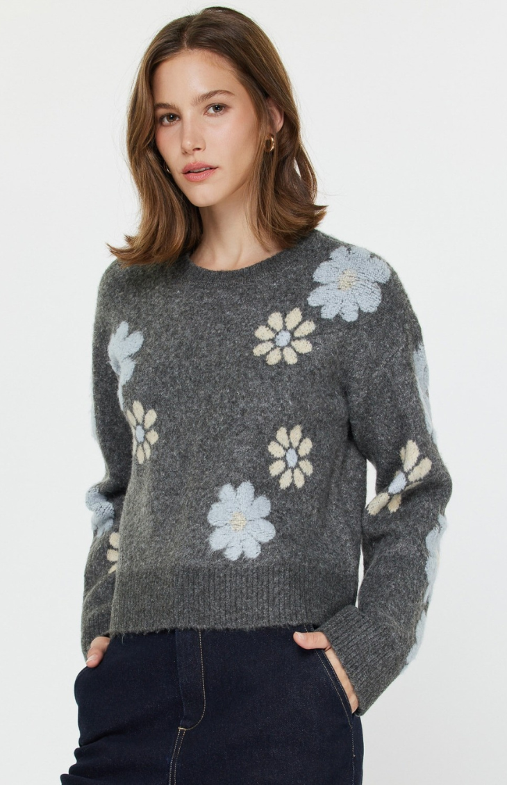 Brighten your cool-weather wardrobe with the Stella Floral Sweater. Crafted from a soft brushed knit, this cozy piece features charming floral motifs in gentle contrast tones. The classic crew neckline, ribbed cuffs and hem, and relaxed, slightly cropped fit make it the perfect blend of playful and polished.