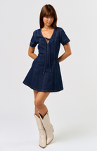 Keep it casual yet chic with the Acorn Flirt Mini Dress. This denim-inspired piece features short sleeves, a scoop neckline with a playful tie-front detail, and contrast stitching for a touch of retro charm. The flattering A-line silhouette and side pockets make it both stylish and functional for everyday wear.