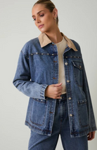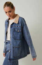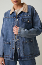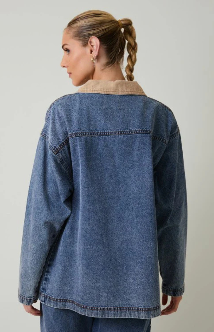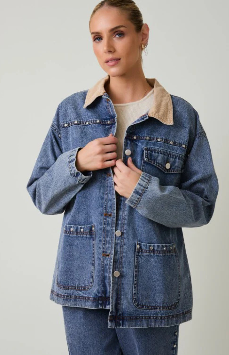 The Calvin Jacket is a cool-girl denim barn style jacket for fall. It features a medium-wash denim and an oversized fit for a casual look. It has stud details and large front pockets that give it some edge, and a tan corduroy collar for a retro feel. Pair with denim bottoms for the trending Canadian tuxedo look or with linen pants for an elevated everyday look while summer turns to fall.