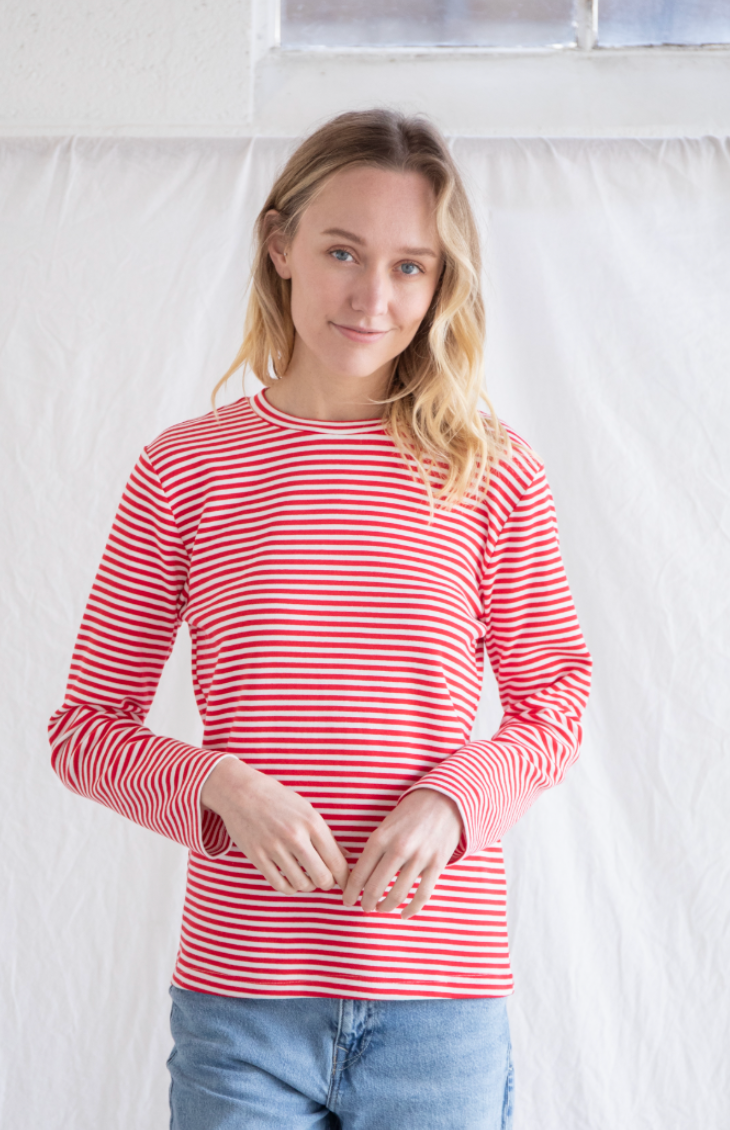 The Chelly Striped Long Sleeve Top is an elevated basic that can be worn all year long with its lightweight cotton fabric, classic tee silhouette, and red and white stripes. Pair with denim or linen bottoms and your favorite flats for your next casual outing.