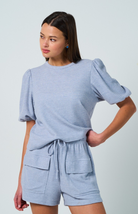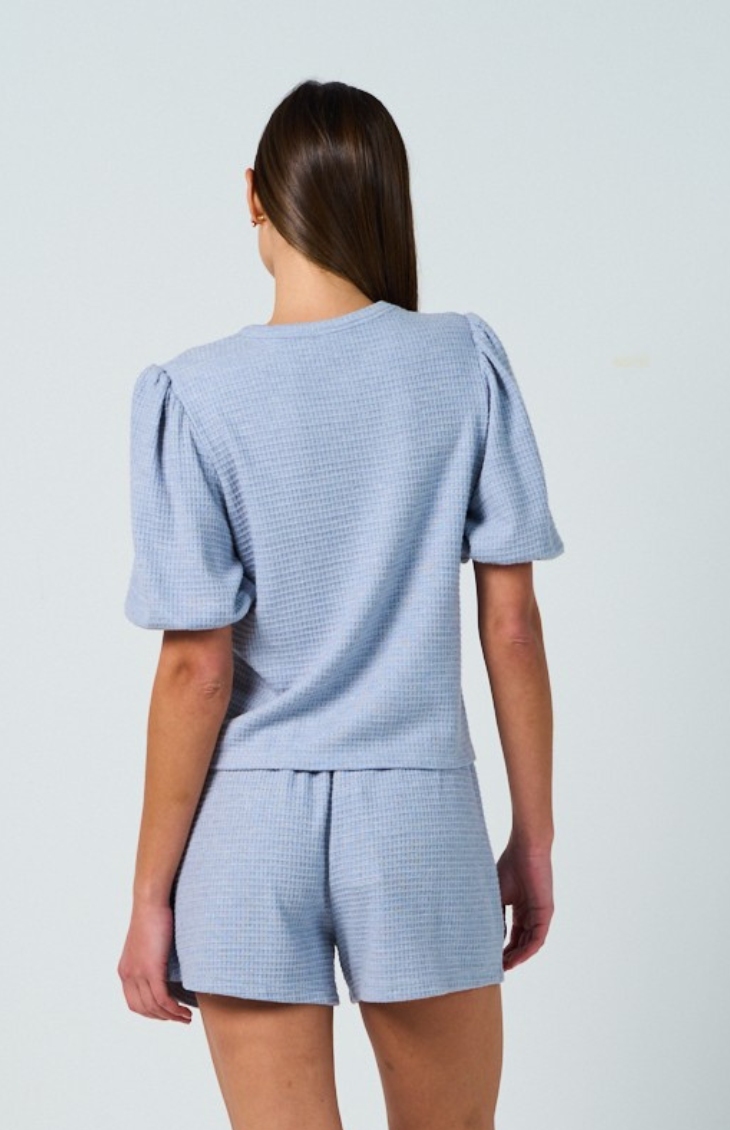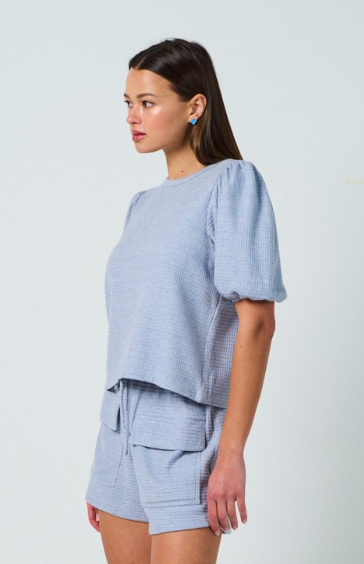 The Cinque Sunsets Top & Shorts Set features a cozy waffle fabric in a flattering light blue. The puff sleeves add a touch of femininity, and the utility-style pockets on the shorts add some edge. The top's relaxed fit and bottom's drawstring make this set comfortable and easy.