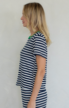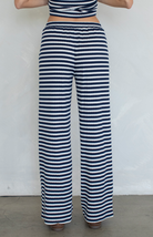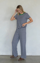 Get ready to lounge in style with the Darby Striped Matching Set. This cozy duo features a navy and white striped short-sleeve top paired with matching wide-leg pants for a relaxed yet put-together look. The soft, stretchy ribbed fabric and pop of green trim at the neckline add a playful touch to your everyday comfort.