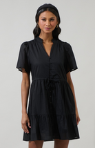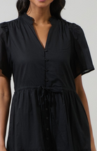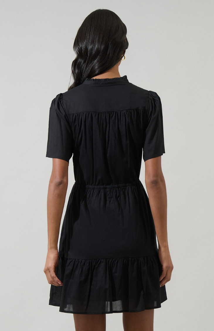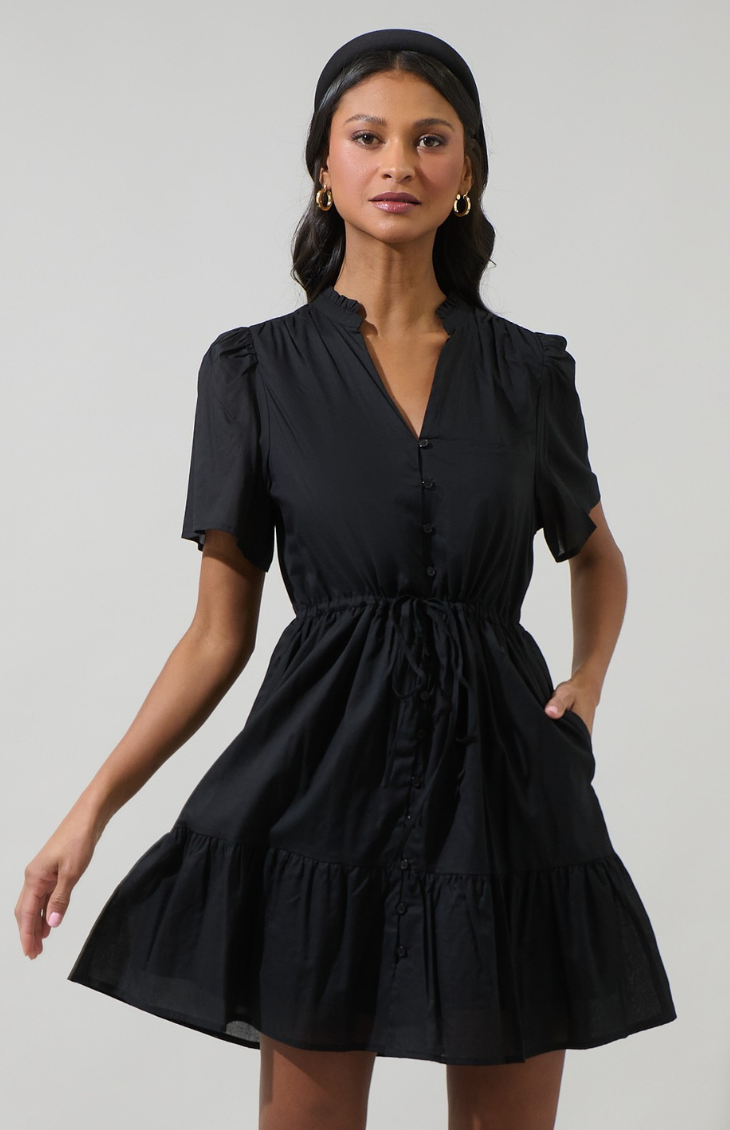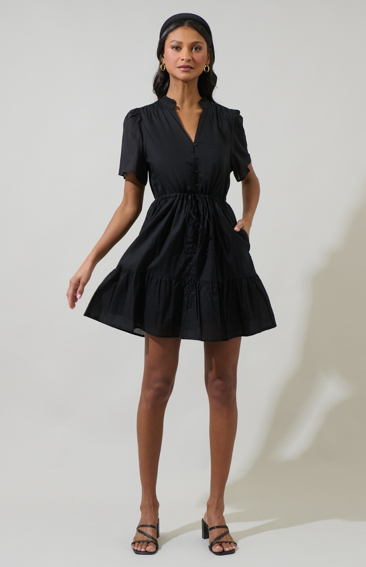 The Dolce Vida Diaries Mini Dress is a classic summer staple that will never go out of style with its breezy black cotton fabric and flattering silhouette. It features a ruffle split neckline, front button-up details, and flutter sleeves to maintain a girly yet sleek look. The drawstring detail perfectly cinches the waist and gives a flattering shape. It also features side pockets and is lined. Perfect to take from the office to dinner/drinks styled with ballet flats or kitten heels.