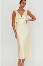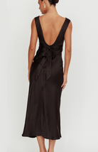 The Ella Maxi Dress is a timeless staple silky formal dress for all of your upcoming special events. Featuring a v-neckline with subtle ruched detailing and an open scoop back for a chic and flattering look. It also has a formfitting panel at the bodice with an adjustable bow tie in the back. With its flowing maxi skirt with a slit at the back for extra movement, this dress will be effortlessly comfortable and elegant for dressy summer outings.