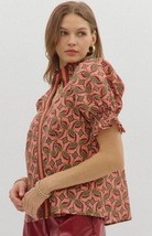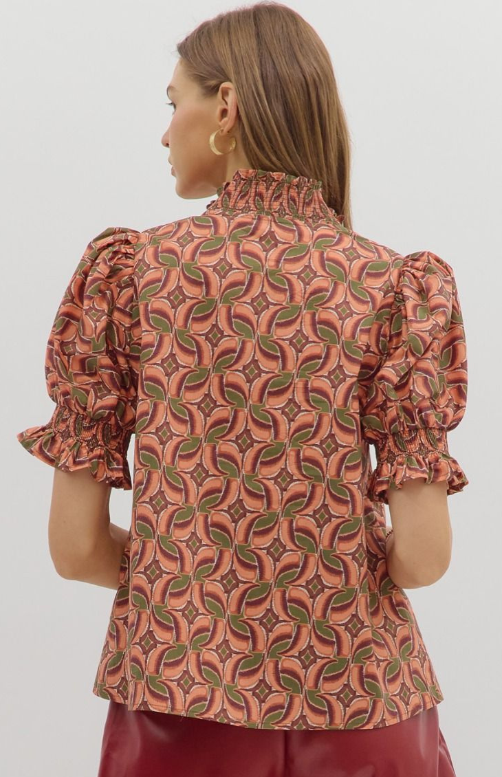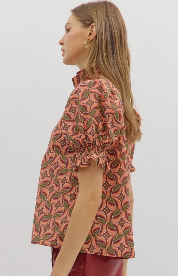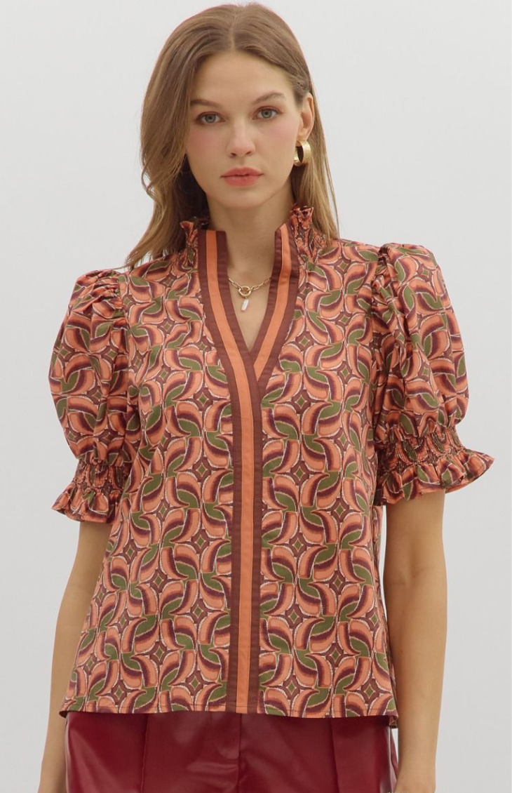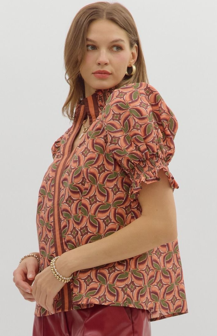 The Falling Softly Blouse is a vibrant, statement-making cotton blouse featuring an intricate geometric print in warm tones of terracotta, olive, and brown. It’s designed with short puff sleeves that gather into ruffled elastic cuffs for a romantic touch, while the neckline showcases a ruffle trim and a flattering V-cut framed by bold contrast striping. The blouse offers a tailored yet relaxed silhouette, making it a versatile piece to pair with trousers, skirts, or shorts for both casual and dressier occasions.