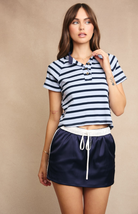 Effortlessly chic and sporty, the Farley Top & Skirt Set is your go-to for casual days with style. The polo top features classic navy and light blue stripes with a playful button neckline, while the silky satin mini skirt adds a touch of elegance with its contrast drawstring waistband. This matching set offers a relaxed yet put-together look perfect for brunch, errands, or a sunny day out.