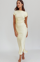 The Isolde Maxi Dress is the epitome of modern romance. It features a sleek high neckline and cap sleeves with flattering side ruching that hugs the waist just right. Turn around to reveal the unexpected drama — a draped open back that adds an elegant edge to its minimalist silhouette.