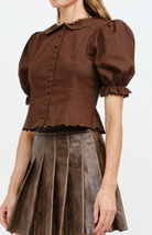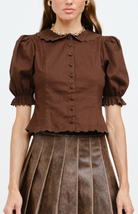 The Jaelynn Top is a chic blouse with dainty button-up closure, eyelet details around the hemlines, and short puff sleeves. The cotton-blend brown fabric is flattering and perfect for fall. Pair with your favorite jeans or denim skirt and brown boots for an elevated daytime look.