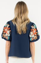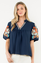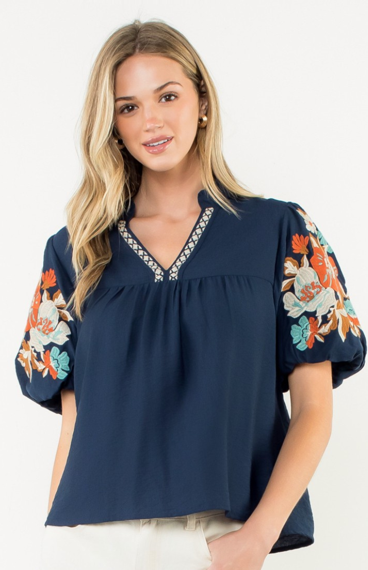 The Maje Blouse features intricate embroidery on voluminous puff sleeves for a pop of color and texture and a notched V-neckline is accented with a contrasting trim. The relaxed, flowy silhouette offers all-day comfort. Perfect for pairing with white tailored shorts or linen pants for a polished boho look.