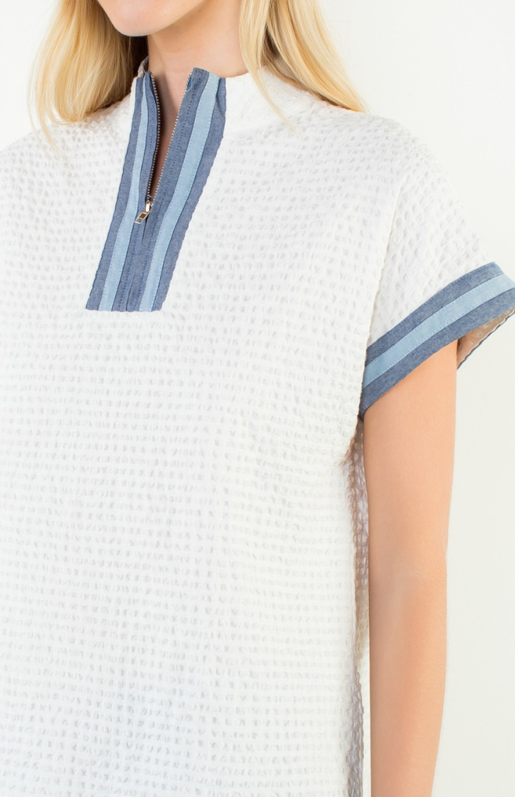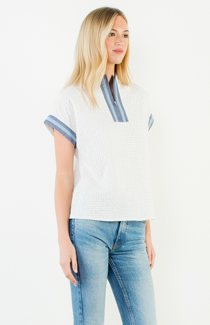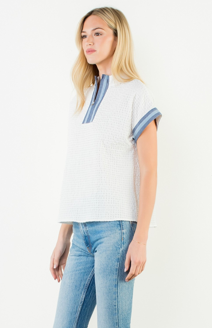 Fresh and effortlessly polished, the Maribel Top features a lightweight woven texture with subtle contrast trim for a refined yet relaxed look. Designed with a short sleeve silhouette and a split neckline detail, this top is perfect for warm days when you want to feel put-together without trying too hard. Easy to style with denim or tailored bottoms.