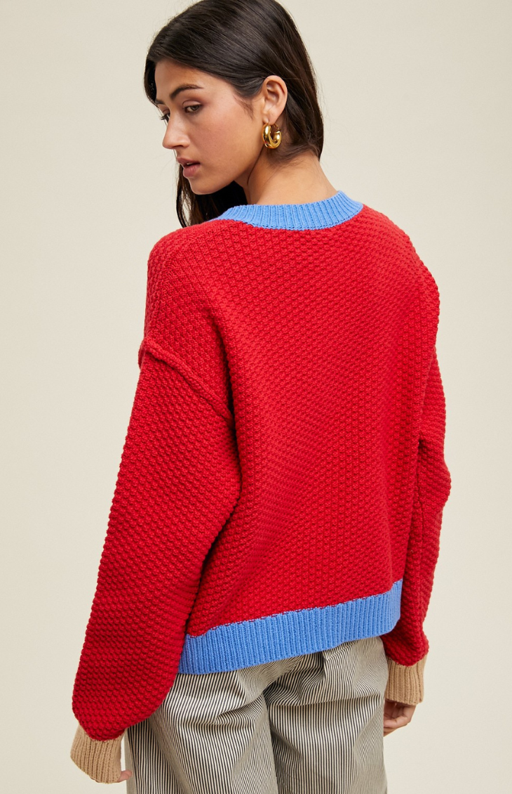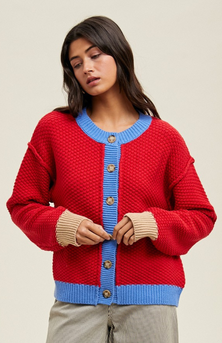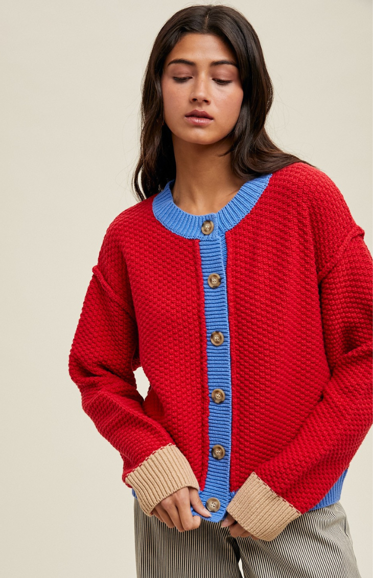 Bold and playful, the Meggie Cardigan stands out with its vibrant cherry red knit, contrasting sky blue trim, and neutral beige cuffs. Featuring a chunky textured stitch, oversized fit, and classic button-front closure, it’s the perfect statement layer to add color and personality to any outfit.