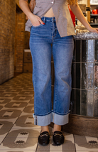 The Nicky Relaxed Straight Cuffed Jeans are cool yet comfortable with their relaxed fit and cuffed bottoms with slight distressing. They are super high rise and medium-wash. Perfect for casual yet elevated outfits all year long.