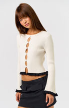 Add a playful twist to your wardrobe with the Puff & Pumpkin Top. This ribbed knit features a scalloped button-front design and charming contrast ruffle trim along the sleeves and hem. With its fitted silhouette and soft stretch fabric, it’s a chic choice for both casual outings and dressier occasions.