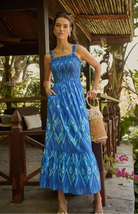 The Spritz & Giggles Maxi Dress features a smocked bodice, ruched thick straps, and a flowy tiered skirt in a vibrant blue artsy print. The ruffled trim around the square neckline adds an extra girly detail. Its lined with side pockets for extra ease. Perfect for tropical trips, pool parties, and dinner by the beach.