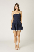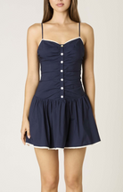The Sweet Sunshine Mini Dress has a coastal and retro feel with its navy fabric and contrast white trim and button details. The button down front and ruching detail at the bottom makes for flattering and interesting texture. The smocked back and flowing mini skirt is versatile and comfortable. Pair with white kitten heels for a chic summer look.