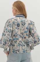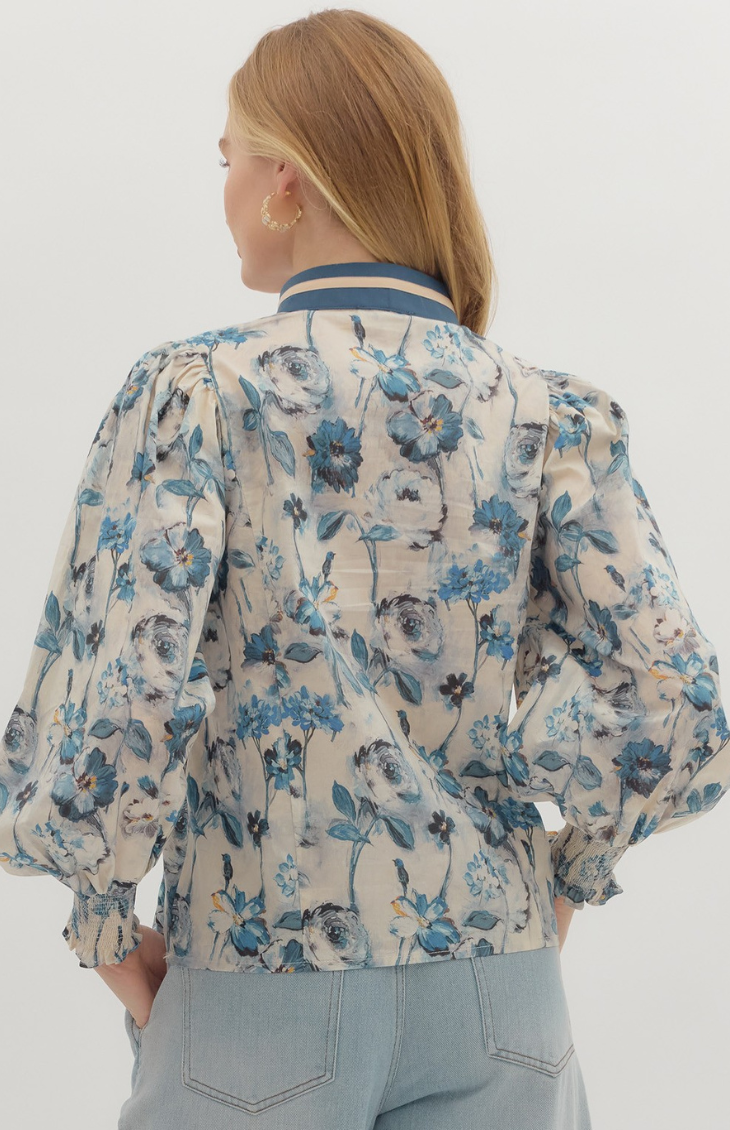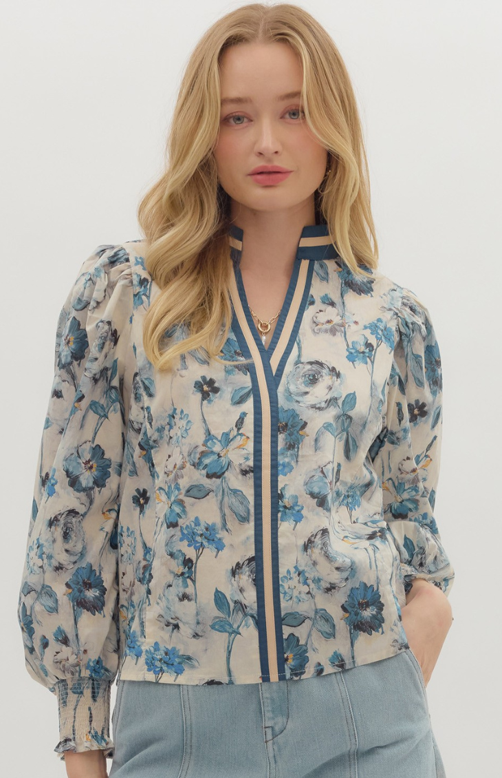 The Theo Top is a charming cotton blouse with an elegant water-color floral print. The long sleeves with smocked cuffs and the lightweight cotton fabric make it perfect for late summer into fall. The multicolor striped detail around the v-neck collar and down the middle of the top adds a modern touch.Β