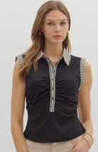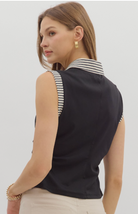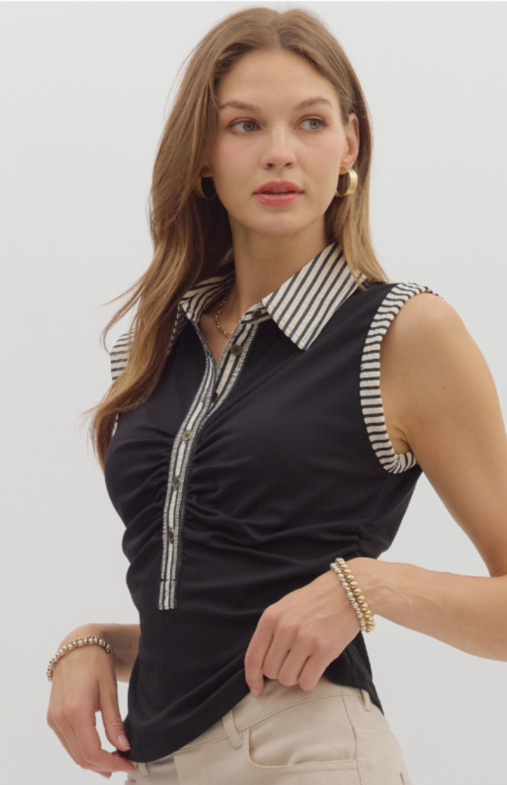 Modern with a touch of edge, the Trastevere Tango Top is your go-to for elevated casual style. This sleeveless black top features flattering ruching down the front, complemented by a bold striped button placket and collar. Matching stripe-trimmed armholes add visual contrast and structure, while the slim, waist-skimming fit enhances your silhouette. Pair it with tailored trousers or denim for a sleek, confident look that transitions seamlessly from days at the office to dinners at night.