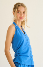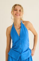 The Venice Vanilla Top is a fun casual top for summer days featuring its bright blue color, subtly ribbed fabric, and button-down front. The halter neckline and open back give it a flirty and beachy feel. The gathered detailing at the side give it a flattering fit. Pair with white denim or linen bottoms for you next casual outing.