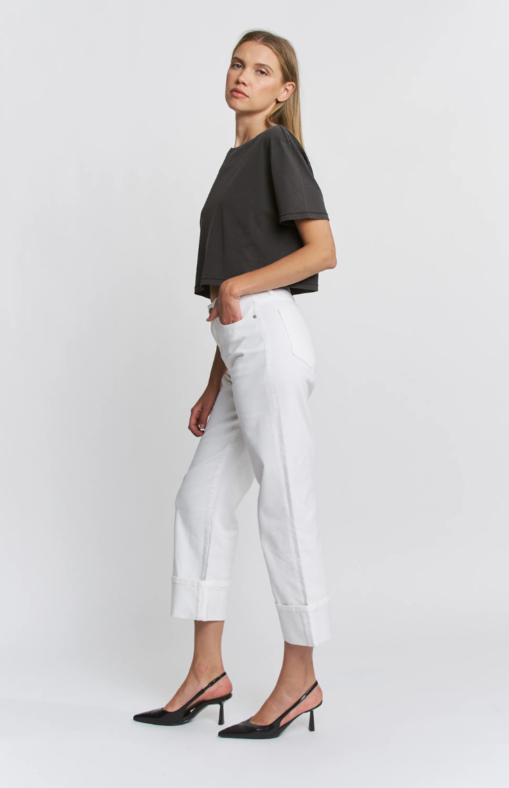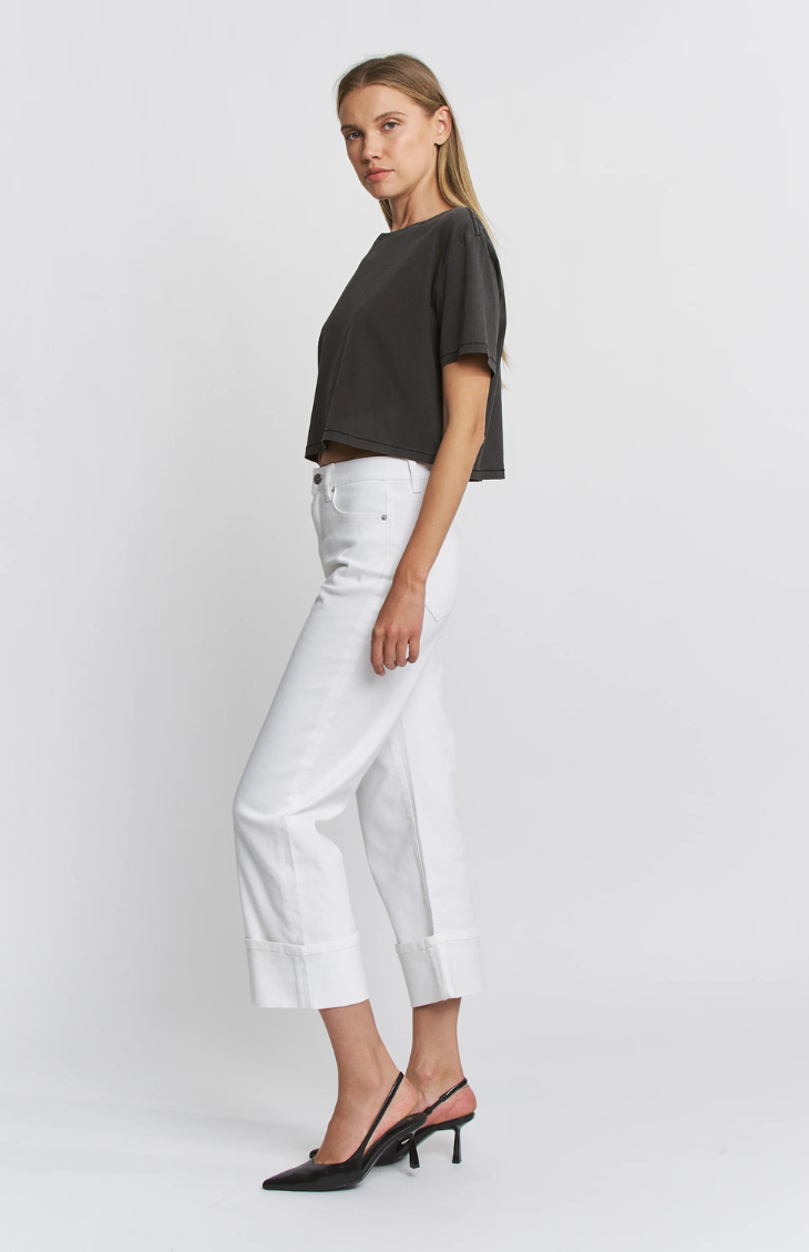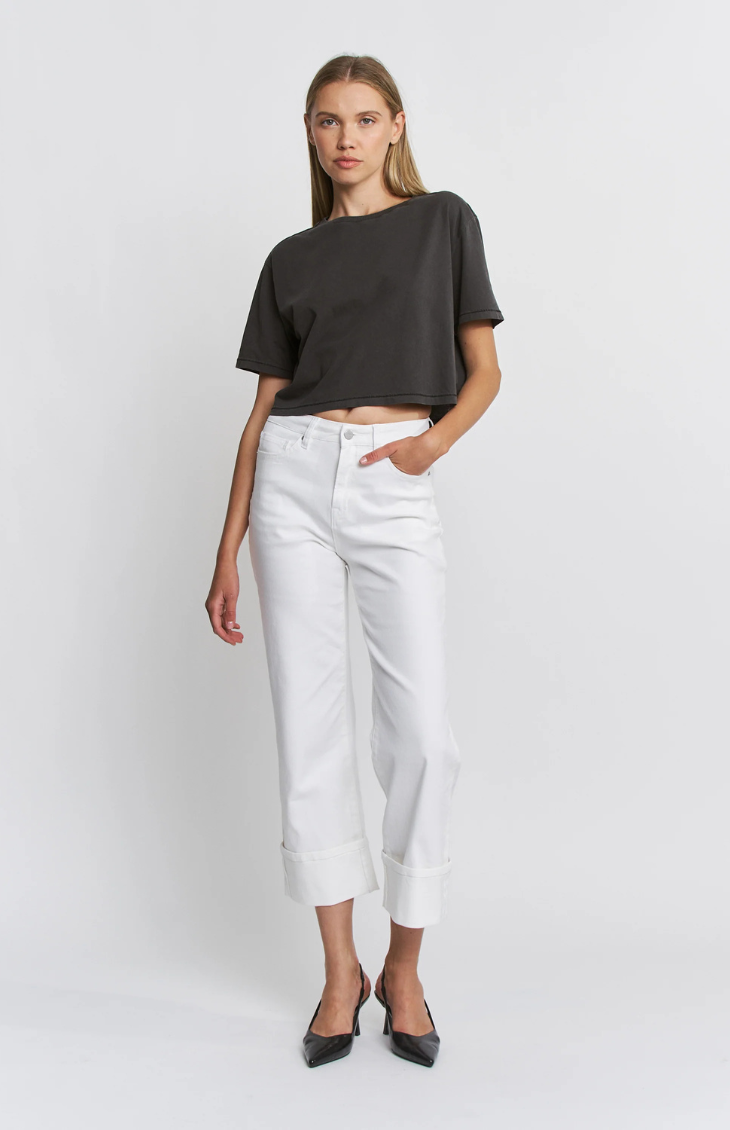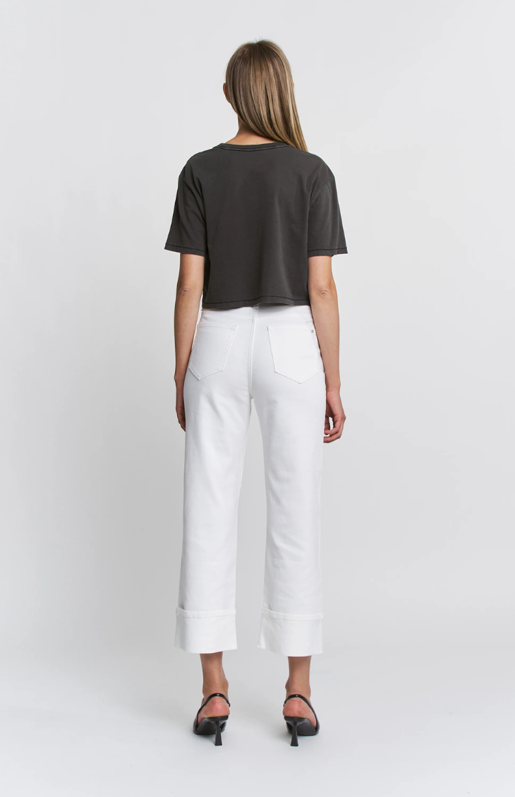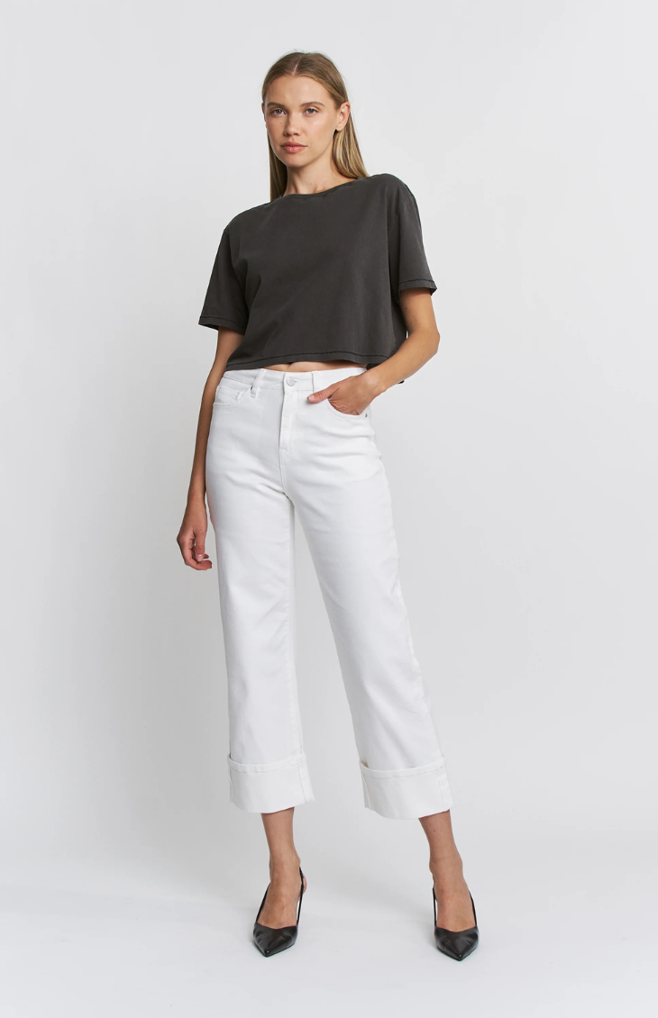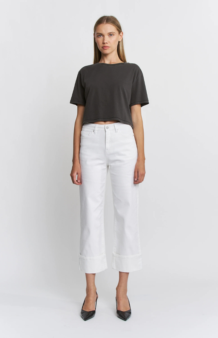 Clean, modern, and endlessly wearable, the High Rise Wide Crop Cuffed jeans are a fresh take on everyday denim. Designed with a flattering high-rise waist and a wide-leg silhouette, this style features a cropped length with a bold cuffed hem that can also be worn uncuffed for a longer look. Crafted with a hint of stretch, they offer all-day comfort while maintaining a structured, polished feel—perfect for dressing up or down.