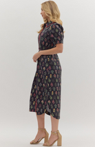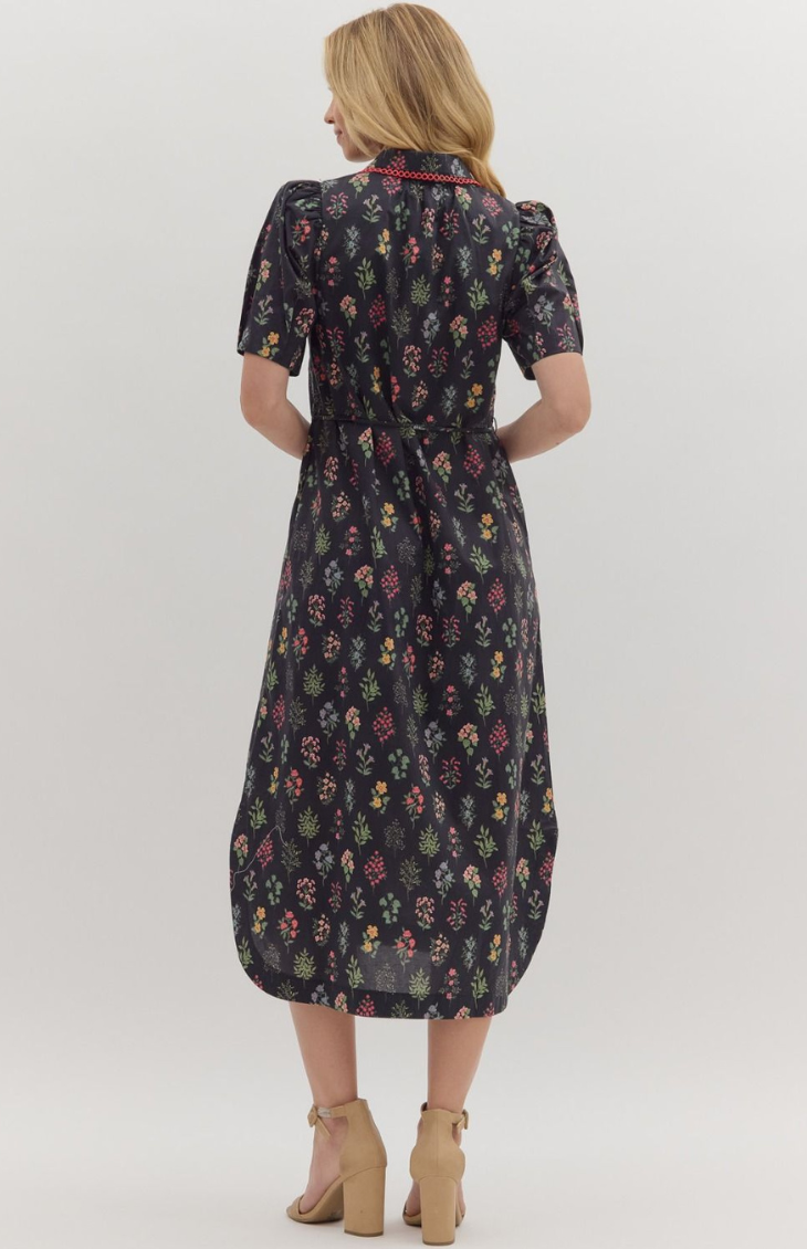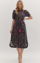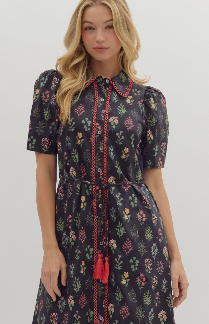 The Annapolis Midi Dress is a cottage-core cotton dress perfect for transitional seasons with its colorful dainty floral print against its black base. The red circular appliqué trim and tassel detailing at the removable tie belt adds a preppy, festive touch. The button-down front, polo collar, side pockets, and slight puff sleeves are playful and chic additions to this piece.