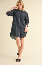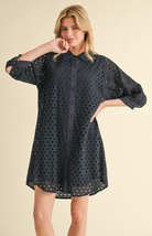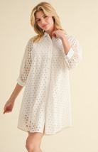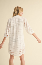 The Aria Mini Dress is a playful staple with circular eyelet lace and a shift silhouette. This cotton shirt dress features a button-down front, 3/4 sleeves, and a polo collar. Easy to dress down for day with your favorite white sneakers or dress up for night with a pair of heels.Β