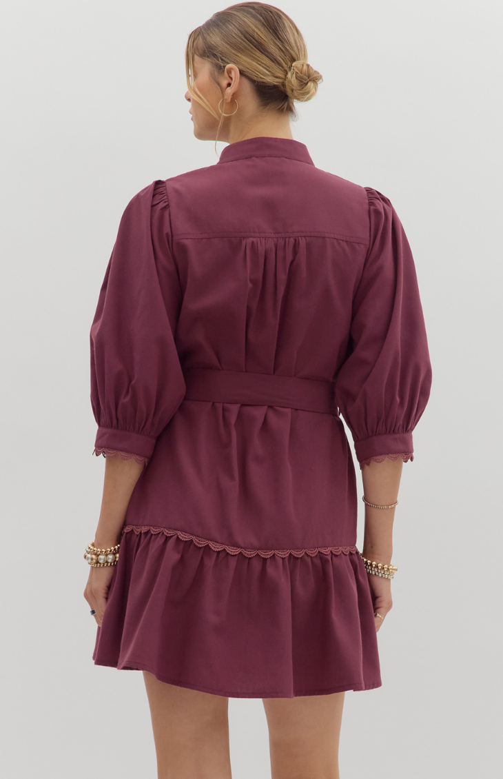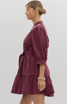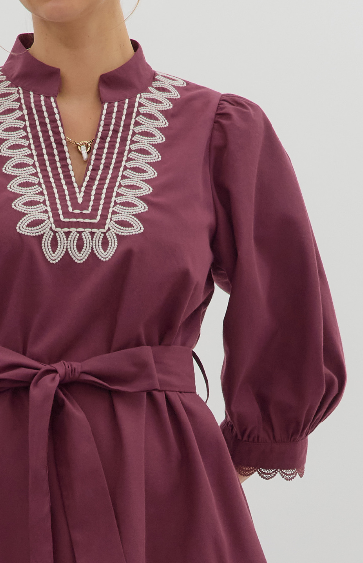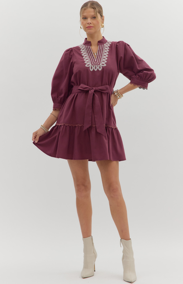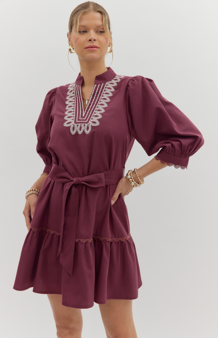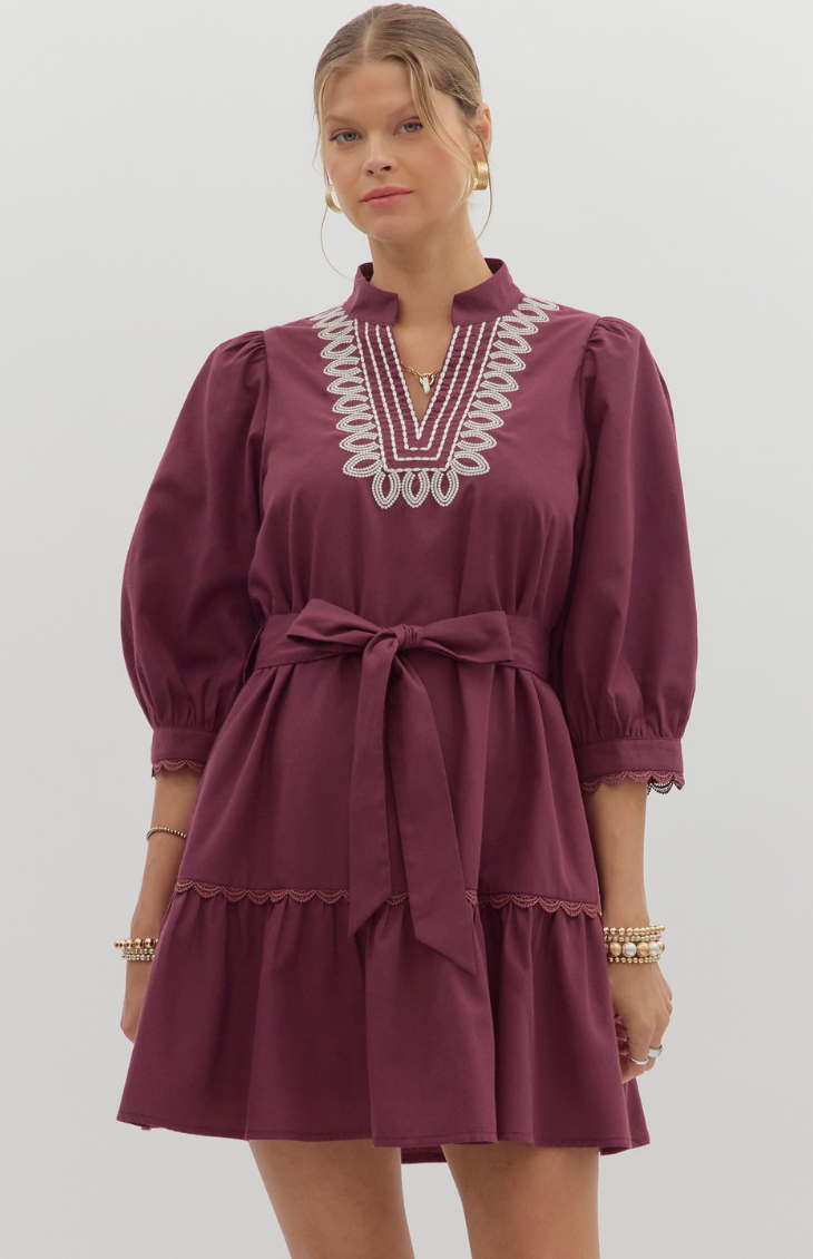 Add a touch of charm to your wardrobe with the Barry Mini Dress. This solid mini dress features scallop trim accents, a ruffle hem, and embroidered V-neck with a band collar for a polished finish. The ¾ cuff band sleeves and removable self belt offer both comfort and versatility, while the lightweight woven fabric keeps it breezy and chic. Perfect for day-to-night wear.