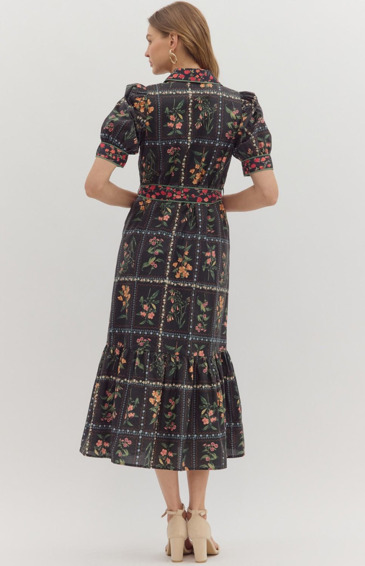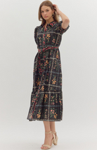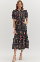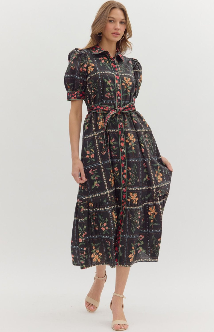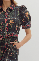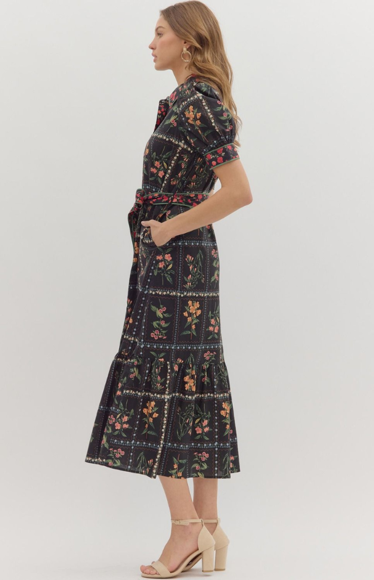 The Dewey Midi Dress features a lovely, vintage-inspired geometric floral print against a black base, making it the perfect piece to wear throughout transitional seasons and for day-to-night outings. The more abundant red flowers around the front button closure, arm cuffs, polo collar, and removable tie belt add extra interest and whimsy to this lightweight cotton dress. Featuring side pockets, short puff sleeves, and a subtle tier towards the bottom of the midi skirt, this dress is charming and playful—ideal for the office, outdoor events, and dinner parties.