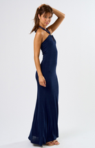Elevate your evening look with the Just A Hint Of Fall Maxi Dress. This sleek halter-neck silhouette features a chic keyhole cutout with a gold accent ring, creating a touch of modern elegance. Designed with a body-skimming fit and floor-length hem, this dress is perfect for special occasions or a night out in style.
