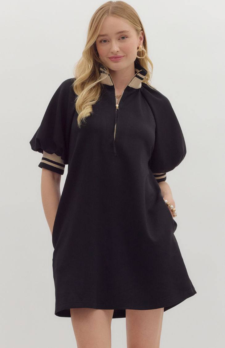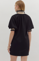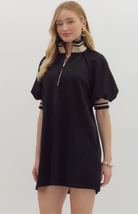 The Louella Mini Dress is sporty-chic with a feminine twist. Featuring puff sleeves, striped trim, and a zip-front collar, this easy shift silhouette is perfect for everything from daytime outings to casual nights out.