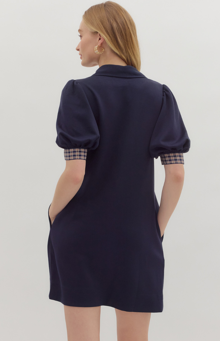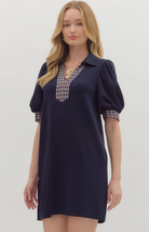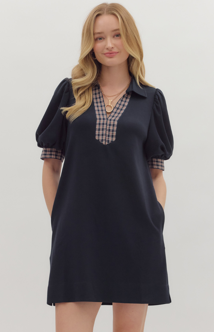 The Maysilee Mini Dress is a chic everyday piece with a touch of sophistication. Designed with puff sleeves, a collared neckline, and plaid trim detailing, it strikes the perfect balance between playful and polished.