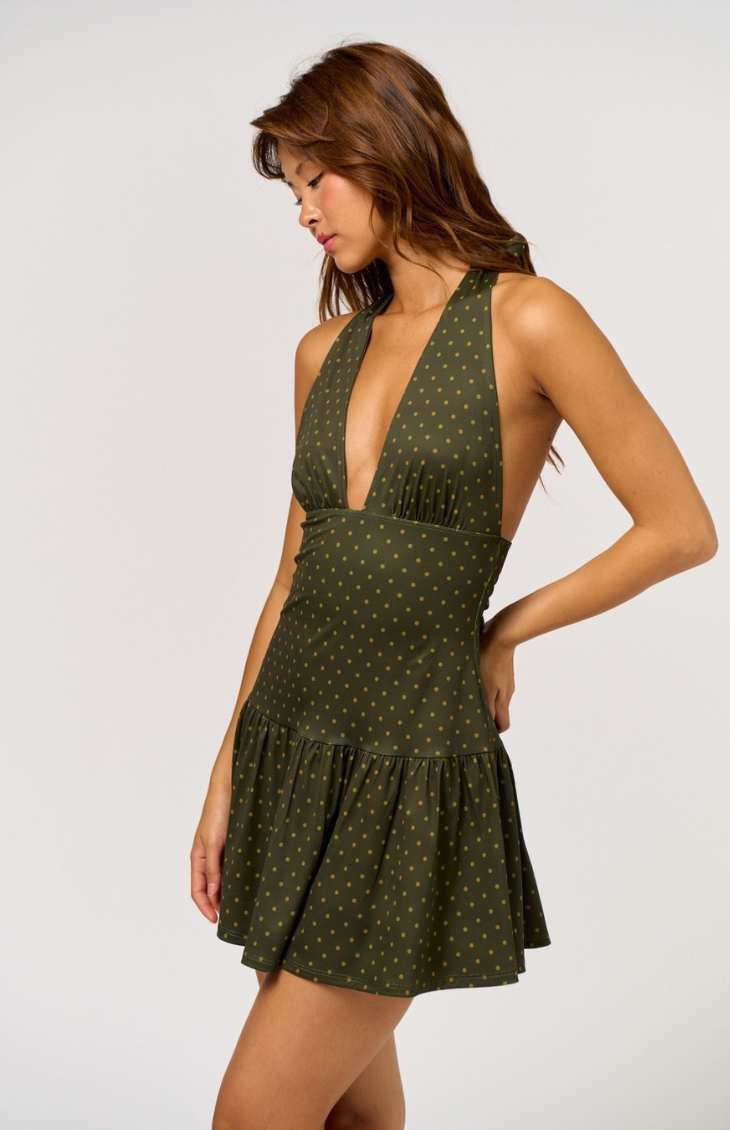 Turn heads in the Playful Pine Mini Dress. Featuring a deep halter neckline, flattering fitted waist, and a flirty ruffled hem, this dress combines effortless charm with playful elegance. The subtle polka dot print adds a fun twist, making it perfect for warm days or a night out.