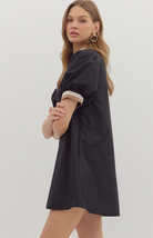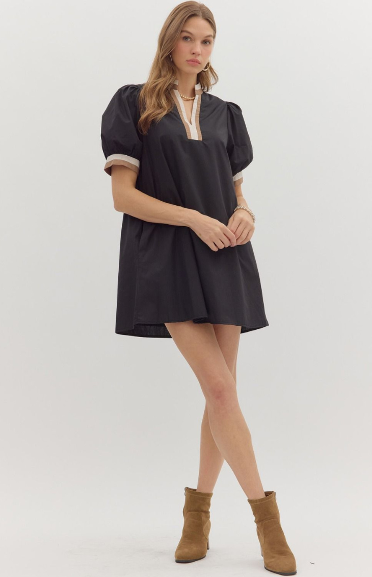 The Russo Mini Dress is an all-year-round staple with its neutral color pallet and timeless silhouette. The tan and cream band accents compliment the black dress, and the puff sleeves add extra interest. Pair with black or brown booties and a suede bag for a classy and chic fall look.Β